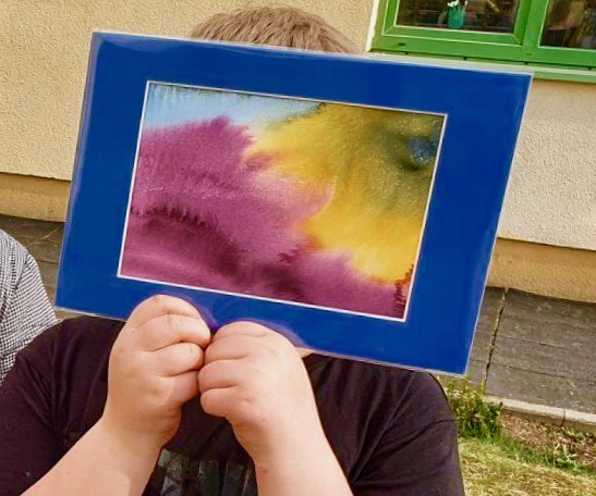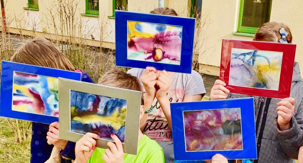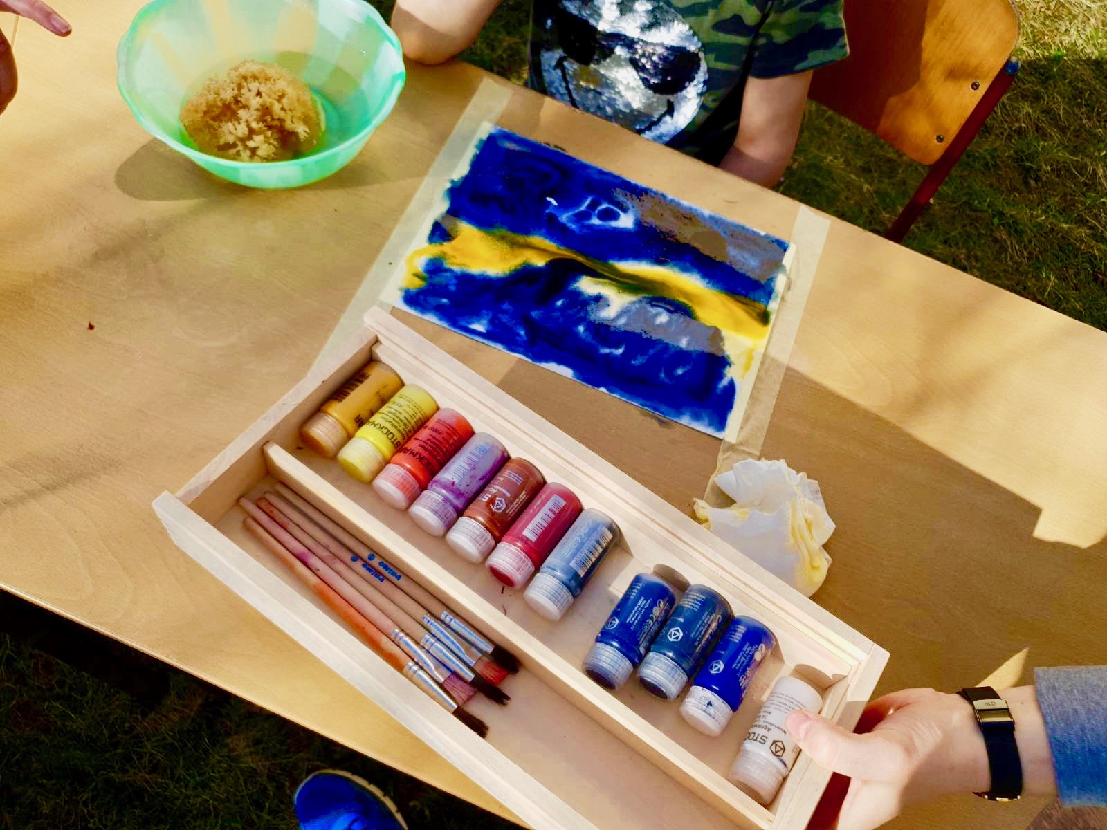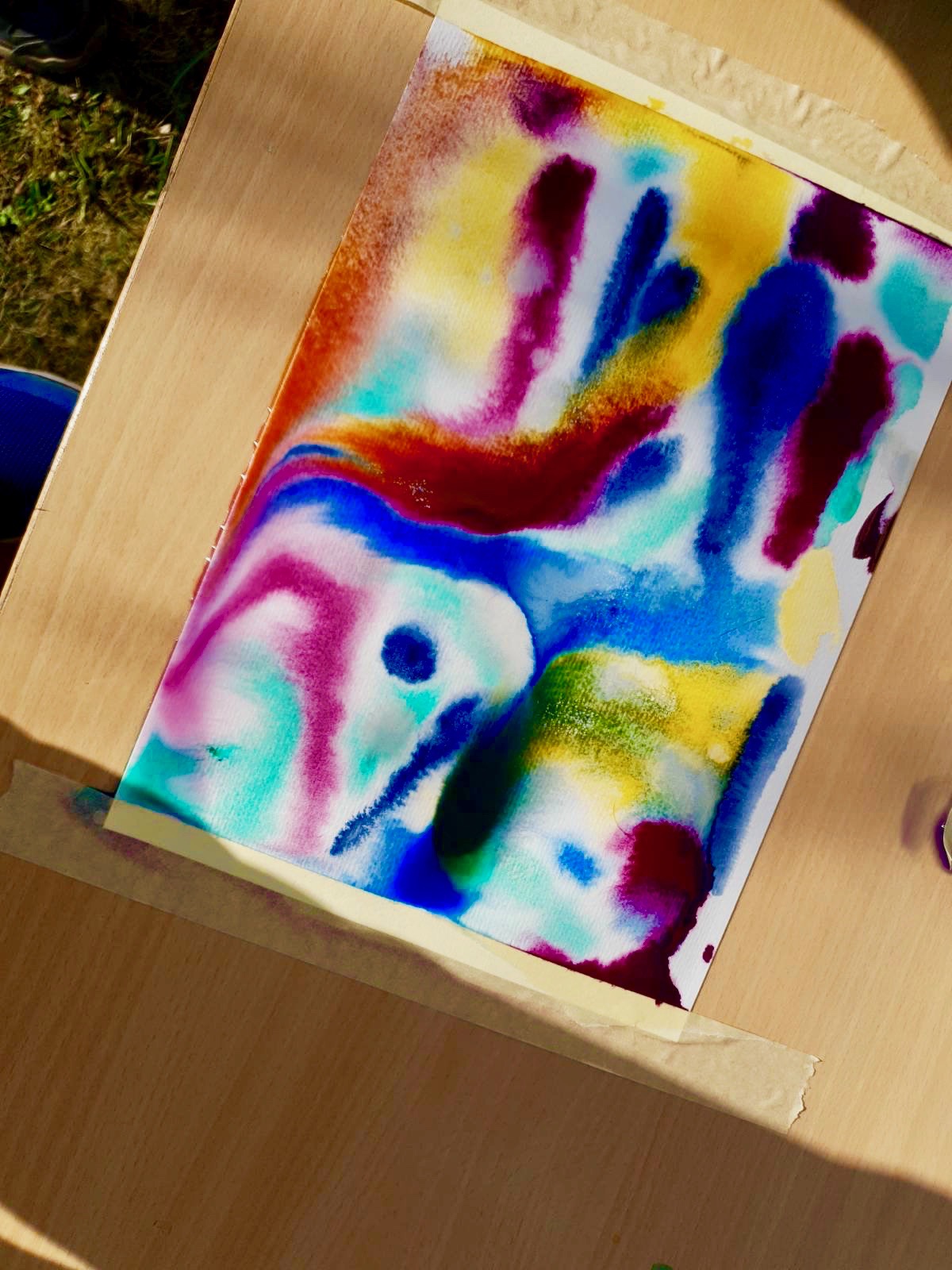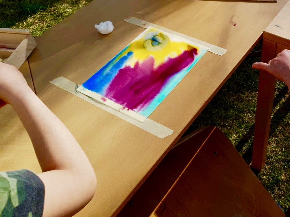 Das schöne Wetter motivierte uns, unser Malprojekt nach draußen zu verlegen. Für alle war es eine neue Technik; und die Kinder widmeten sich ihr mit Neugier und Ernsthaftigkeit. Es sind wunderschöne Kunstwerke entstanden – und mancher kleine Künstler war wohl erstaunt über sich selbst, und natürlich zu recht stolz.