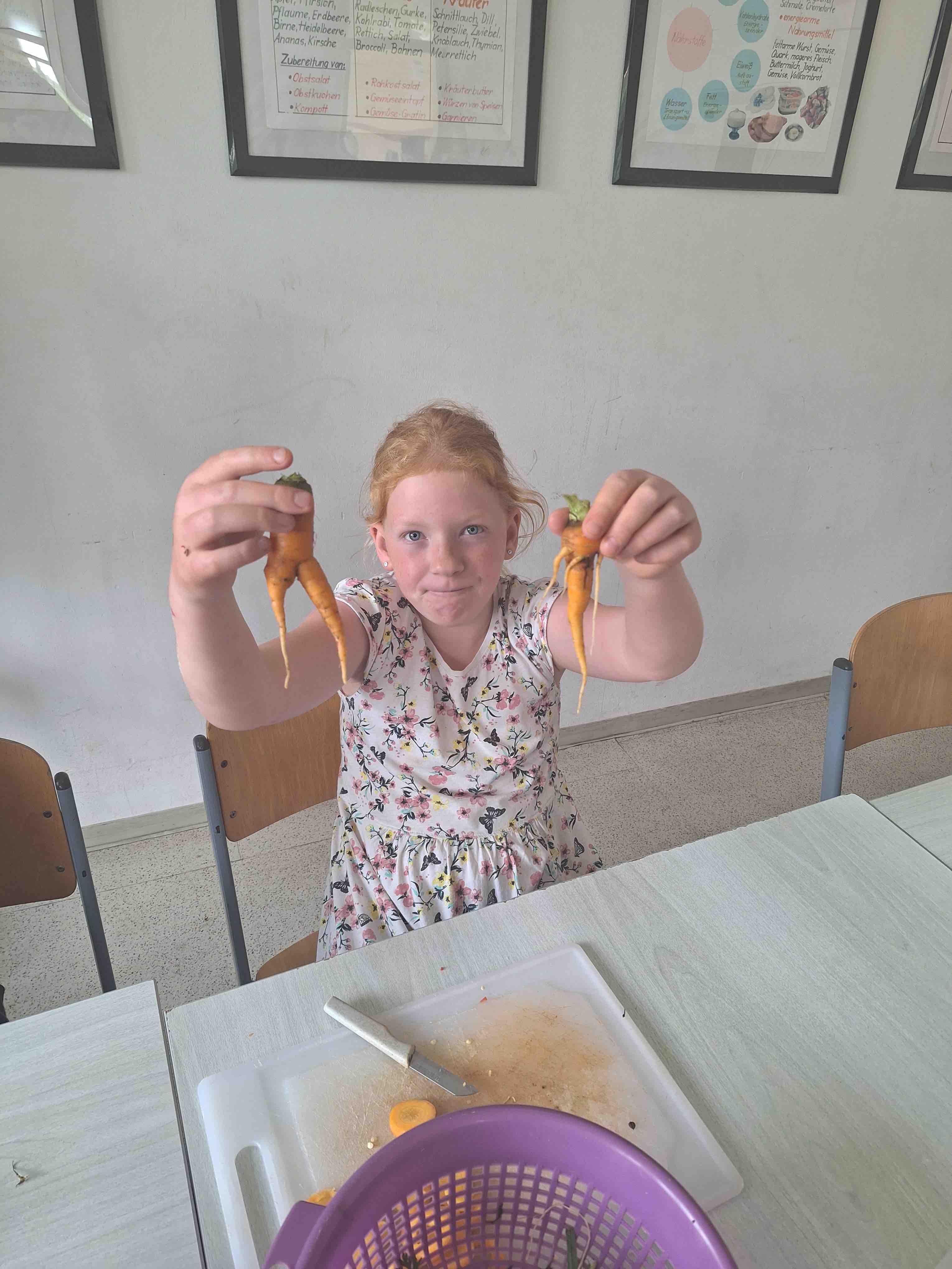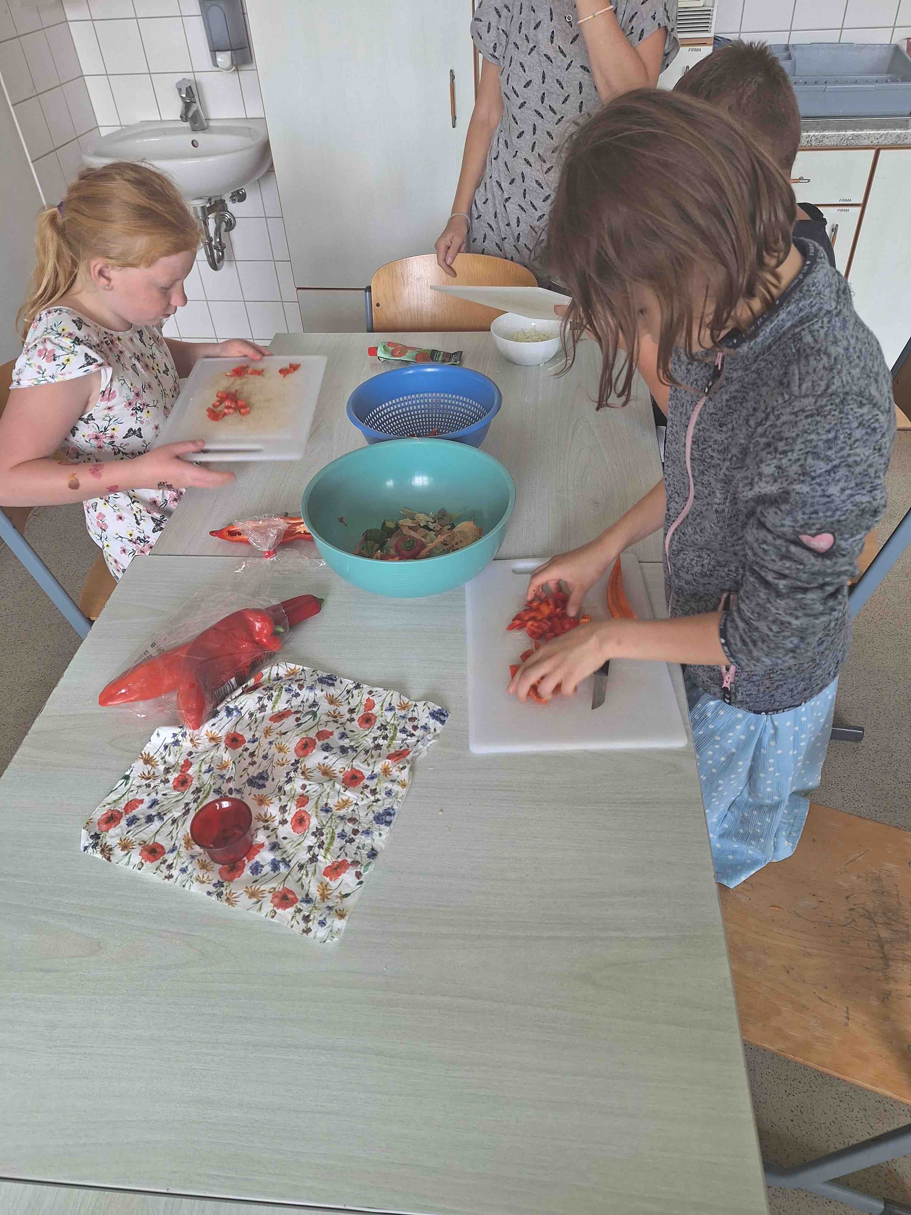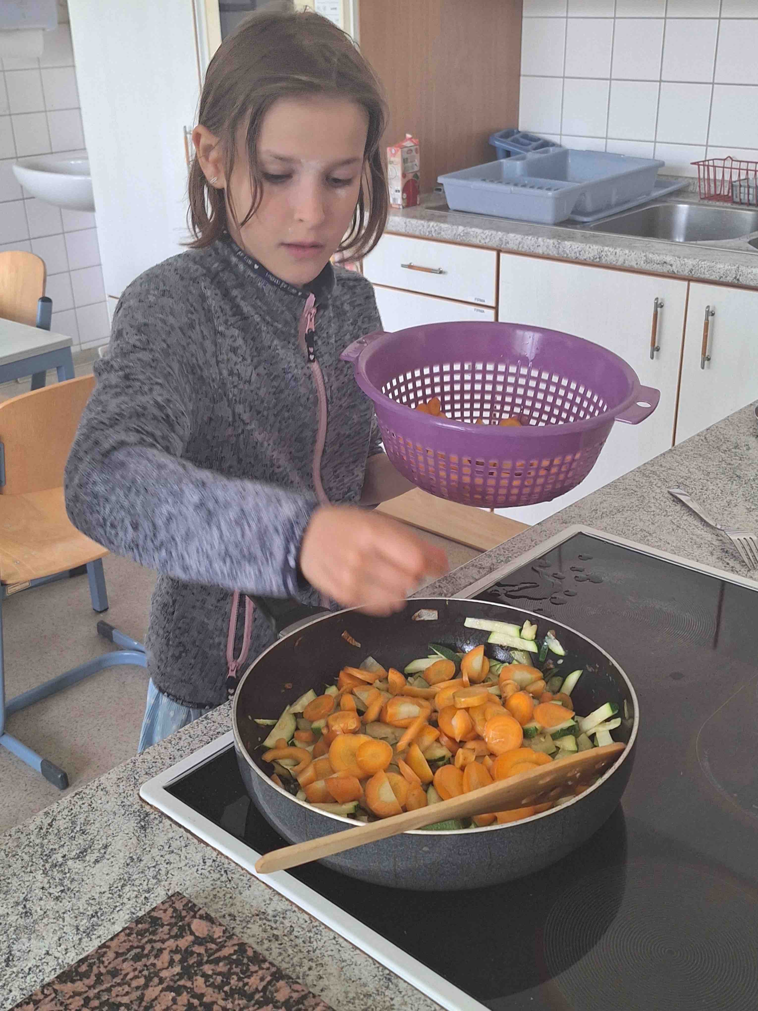 Jeweils 3-4 Kinder sind im Wechsel an den Vorbereitungen der Mahlzeiten aktiv beteiligt. Besonderen Spaß hat hier Sophie mit ausgefallenen Möhren, während Anna-Lena die Gemüsepfanne versorgt.
