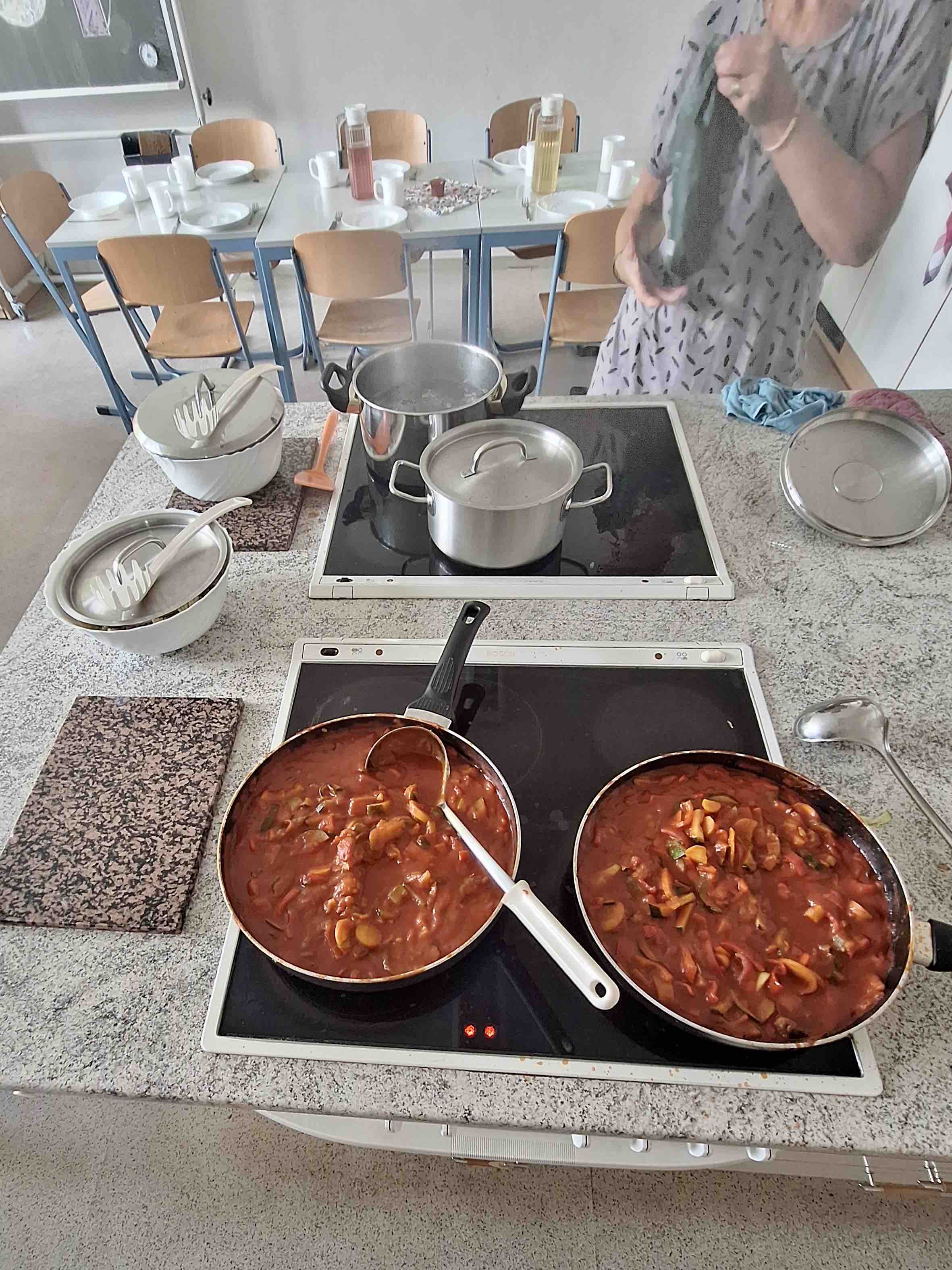Andere Kinder haben inzwischen den Tisch fachgerecht gedeckt, der von Frau Bauer nochmal überprüft wird. Nun warten Nudeln und die Gemüsepfannensauce auf viele hungrige Münder.