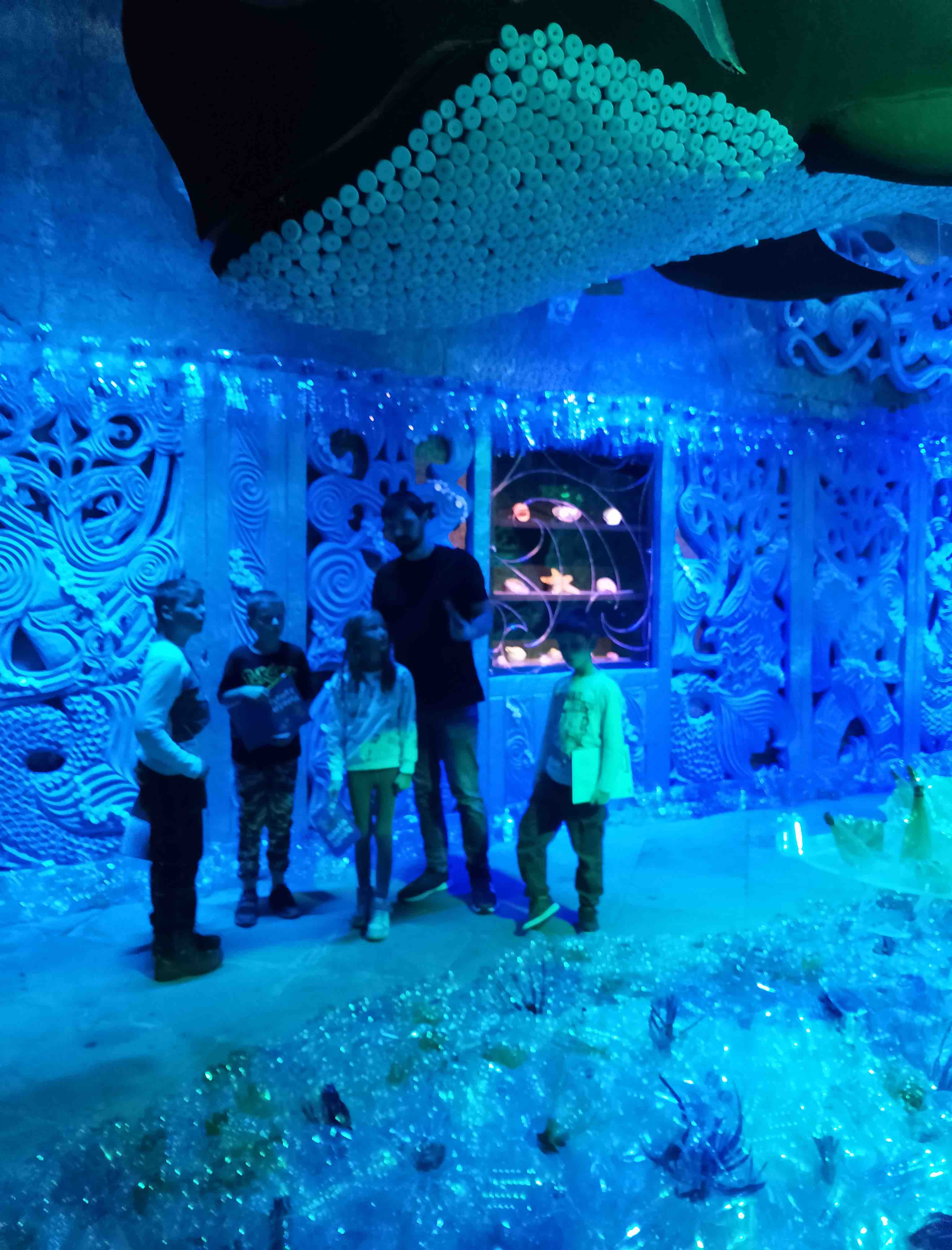 Eine Unterwasserwelt aus Plastikflaschen samt Riesen-Kalamar, ein Geruchs-Memory und eine über zwei Räume reichende Skulptur aus Pappe.