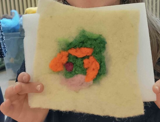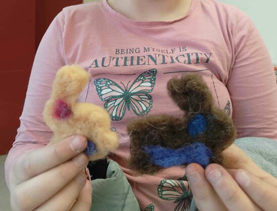 Sogleich waren alle begeistert vom Material Wolle: so weich, und so schöne Farben! Das half, die Geduld aufzubringen, die für ein schönes Werkstück notwendig war. Schließlich entstanden an zwei Nachmittagen wunderschöne unglaublich kreative kleine Werke, die als Ostergeschenk sicher liebe Angehörige erfreuen werden.