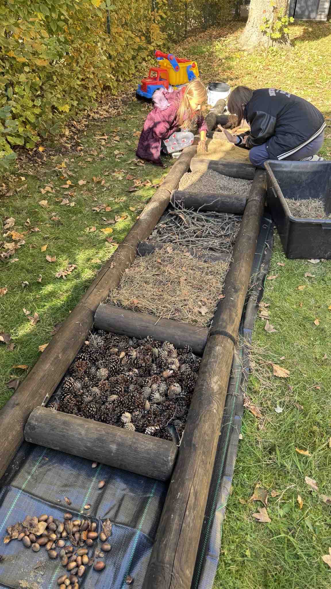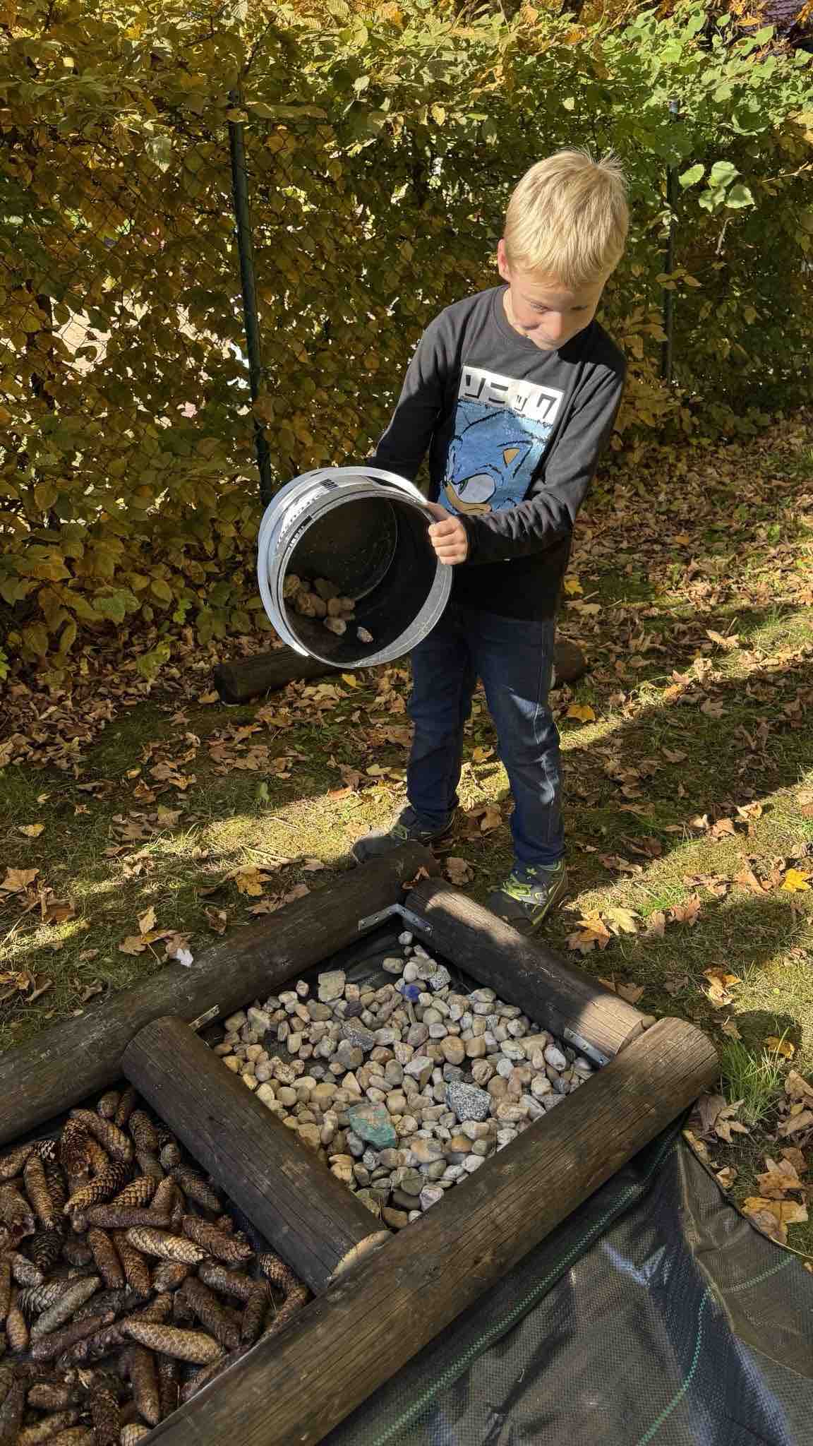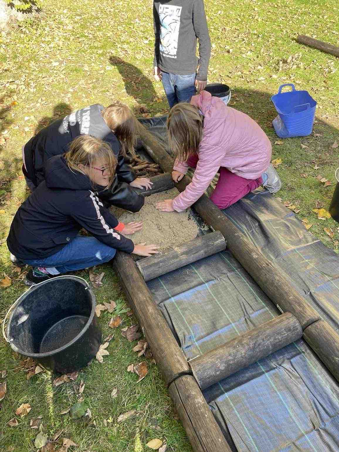 Anschliessend brachten die Kinder die gesammelten Materialien in Eimern zur Baustelle und befüllten die einzelnen Fächer mit dem jeweiligen Material.