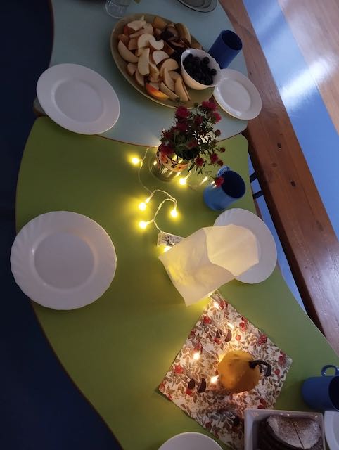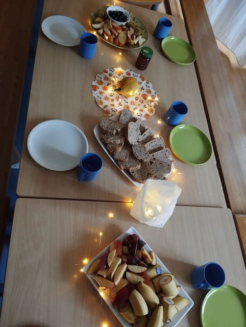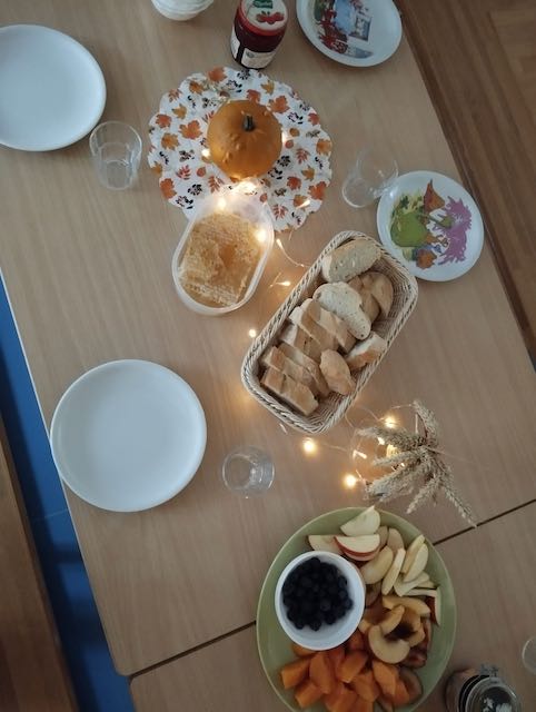 Auf den liebevoll dekorierten Tischen fanden sich auch bunte Obst- und Gemüseplatten, frische Honigwaben und Minze für einen herrlich duftenden Pfefferminztee. Die Tische waren festlich geschmückt: Zierkürbisse, Getreideähren, Lichterketten und bunte Blumen verwandelten unseren Mehrzweckraum in eine kleine Herbst-Oase.