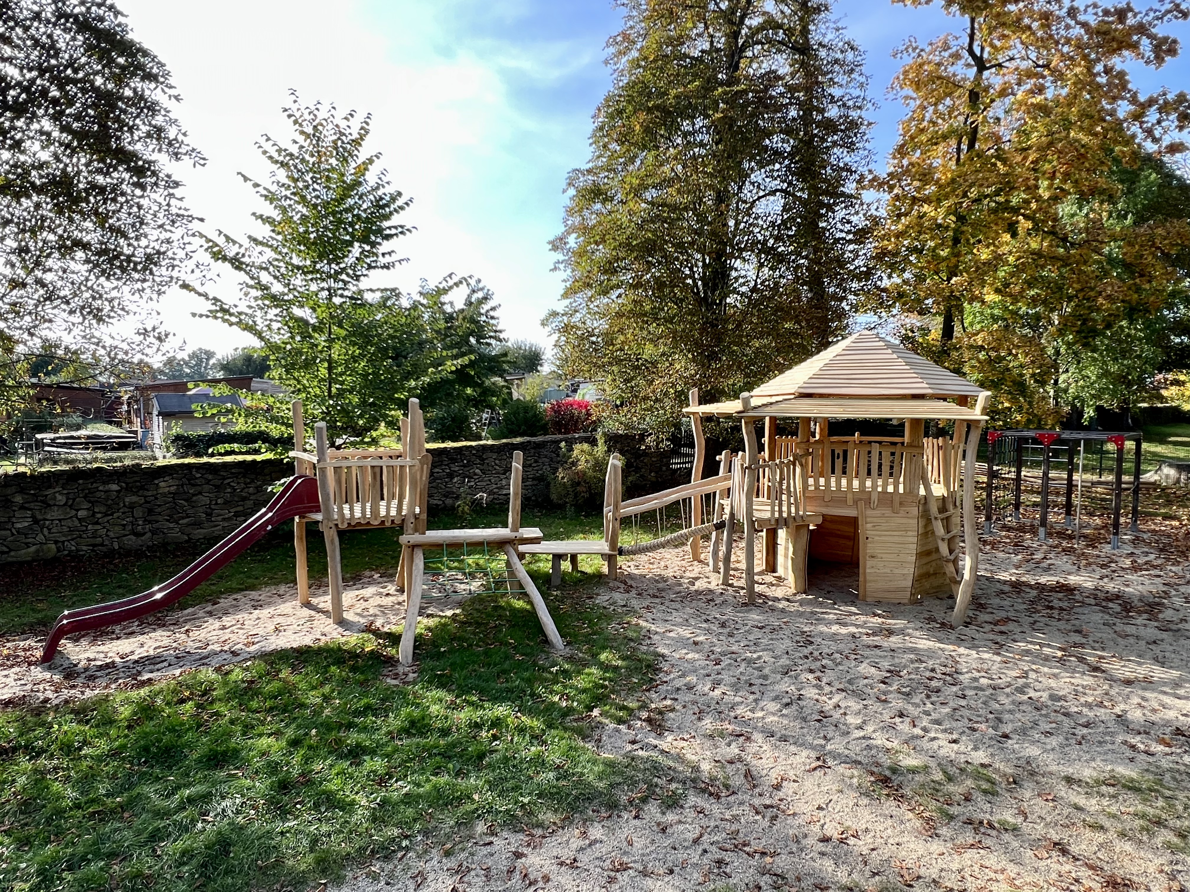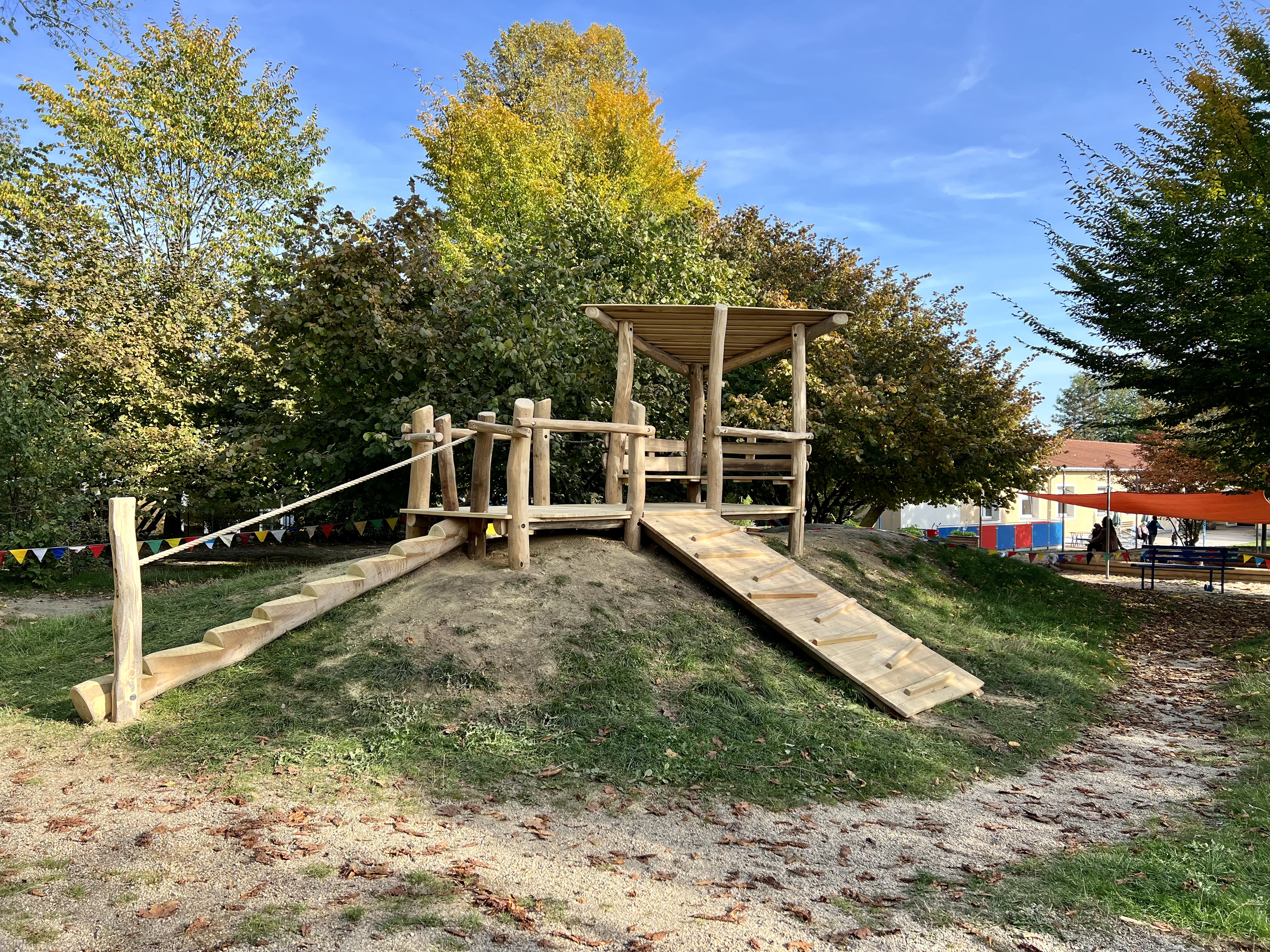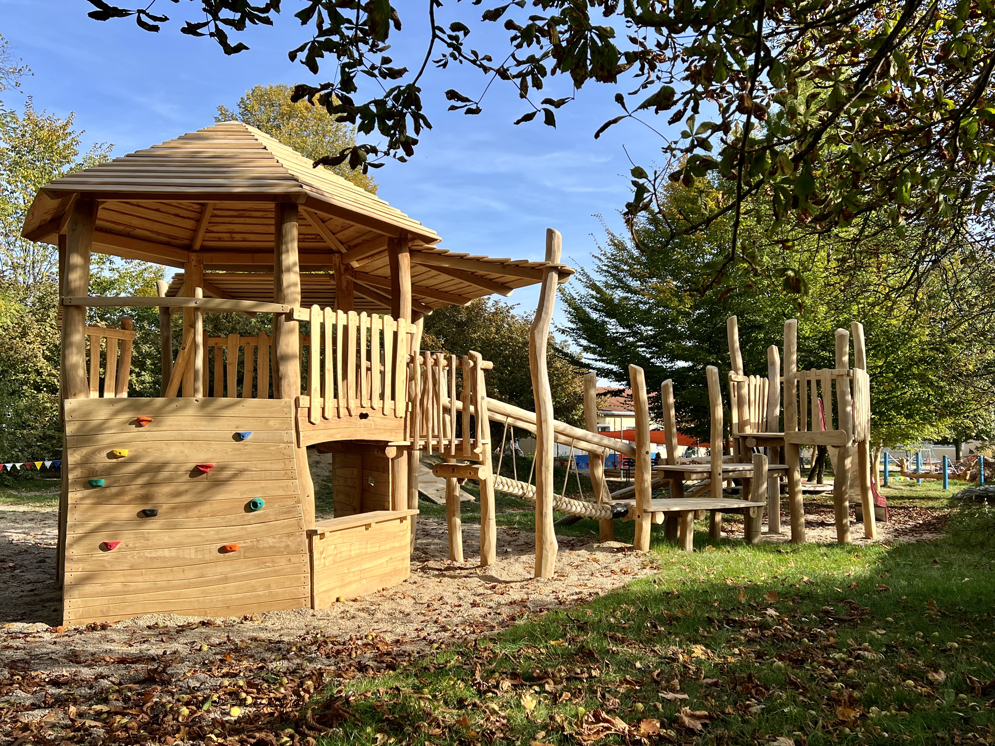 Dabei legte der Träger Wert auf Tradition: Die alte Rutsche wurde ebenso einbezogen wie das Pferd für kleine Reiter. Zwar war das alte Pferd nicht mehr zu retten; der vorherige Träger hatte es abgebaut, und es schimmelte vor sich hin. Aber der Spielplatzbauer Fa. Wildholz baute ein neues, auf dem nun über den Spielplatz galoppiert wird. Gemeinsames Schwingen in Resonanz kann hier geübt werden. Die Kinder erfahren: Aufeinander achten und kooperieren kann die Kräfte potenzieren. Der beliebte Kletterplatz zwischen den Bäumen erhielt eine zweistufige Holzterrasse, die vor Nässe schützt und zugleich mit Vorhängen für Rollenspiele sowie als kleine Bühne für Auftritte genutzt werden kann. Eine neue Doppelschaukel fördert Streck- und Beugebewegung, den Gleichgewichtssinn und Entspannung. Auf dem bisher kahlen Hügel ist nun ein in unterschiedlichem Schwierigkeitsgrad ersteigbarer attraktiver Aussichtspunkt aus Holz entstanden. Oben sein, in Ruhe beobachten, die Perspektive wechseln, das sind wichtige Lernerfahrungen. Und es geht noch höher. Ohne Zweifel ist der neue Kletterturm das besondere Highlight der neuen Anlage. Hinauf kommt man auf verschiedenen Wegen: Boulderwand, Seilsteg und Leiter bieten hier vielfältiges Bewegungs-, Orientierungs- und Gleichgewichtstraining. Und für die ganz Mutigen geht es über einen Balancierpfad zu einem weiteren Plateau mit der Rutsche. Im rückwärtigen Teil des Turmes sorgt ein kleiner Verkaufstresen für ruhige Spielmöglichkeiten. Auch der Krippengarten hat ein altersgerechtes Spielgerät erhalten mit Häuschen, Rutsche, Überweg und verschiedenen Zugangsmöglichkeiten. Und die neue Abgangshilfe am Hügel verhindert nun, dass die Jüngsten mit zu viel Schwung weiter so schnell fallen.