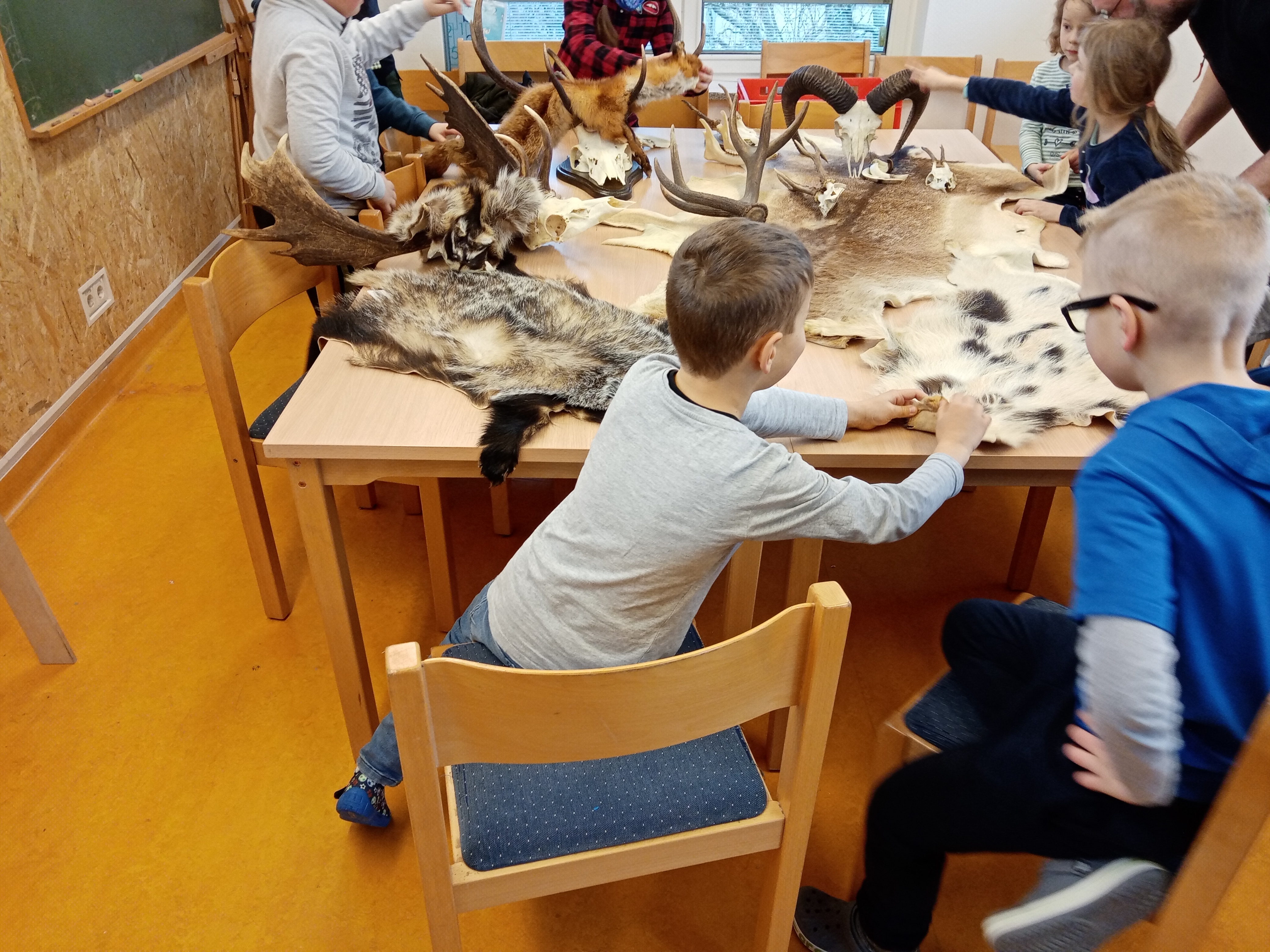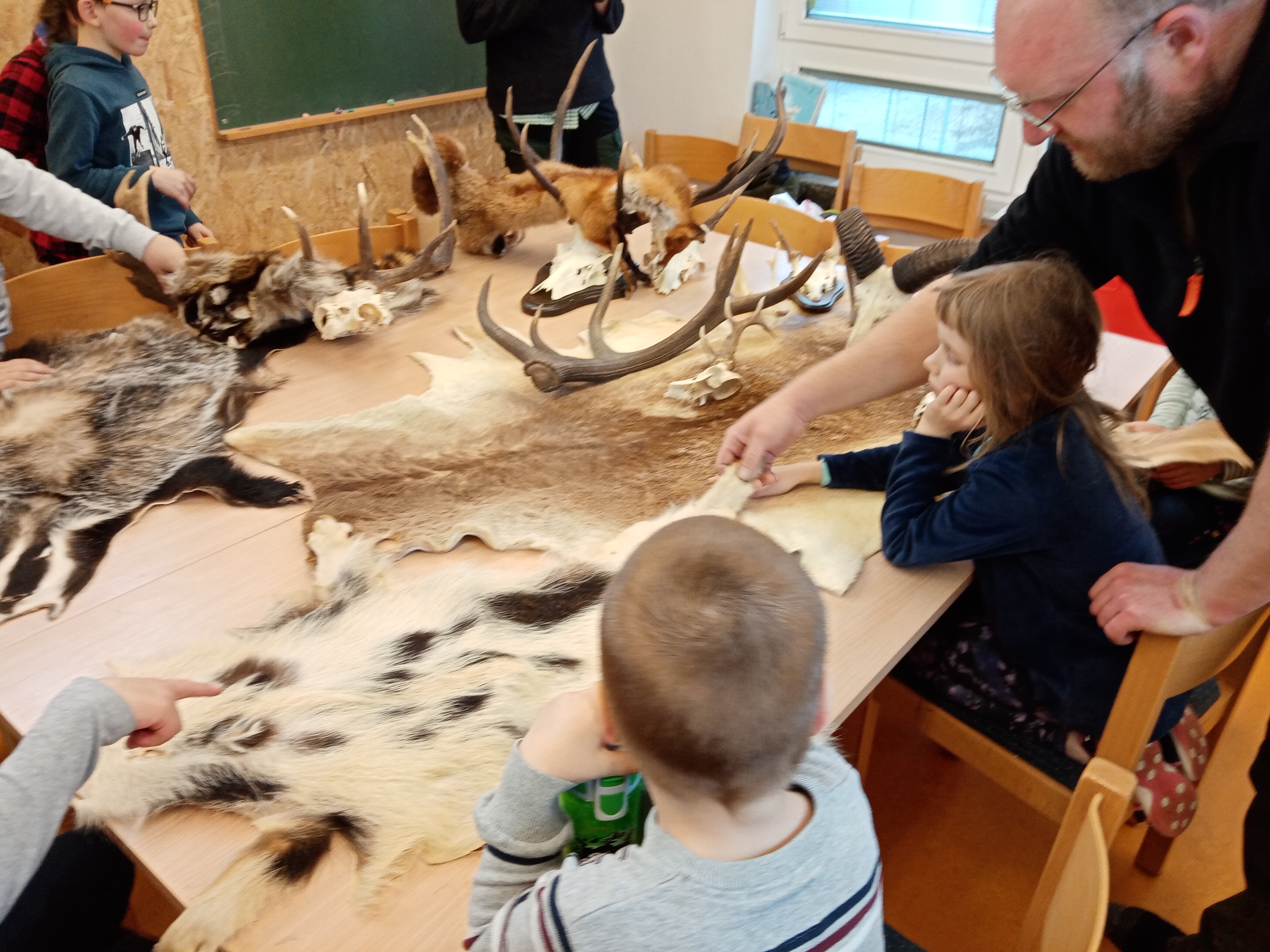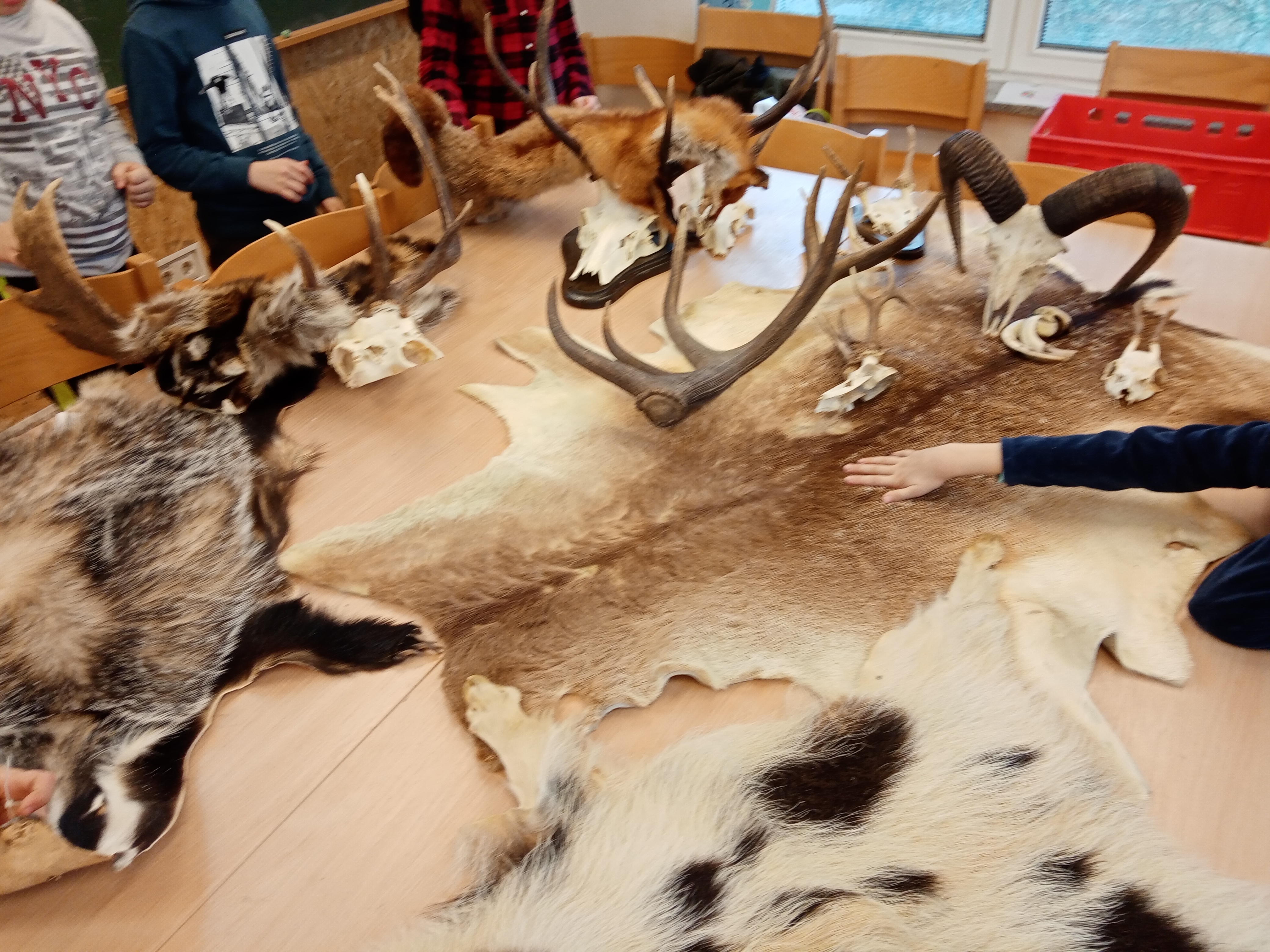Der zweite Teil des Tages war noch einmal superspannend: Herr Schubert hatte Geweihe, Felle und Zähne von bekannten heimischen Waldbewohnern mitgebracht. Das war toll. Wer hat schon mal einem Fuchs, einem Dachs oder einem Wildschwein das Fell gestreichelt und ein Mufflon bei den Hörnern gepackt? Wir konnten es. Und wir lernten dabei viel über den Schutz des Ökosystems, Fressgewohnheiten, Revierverhalten und weitere Besonderheiten verschiedener Tiere. Nun sehen wir den Wald und unsere Umgebung mit neuen Augen.