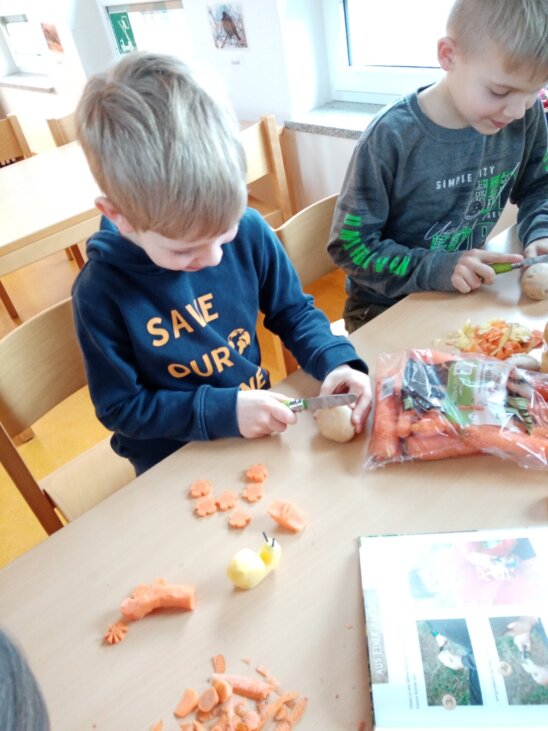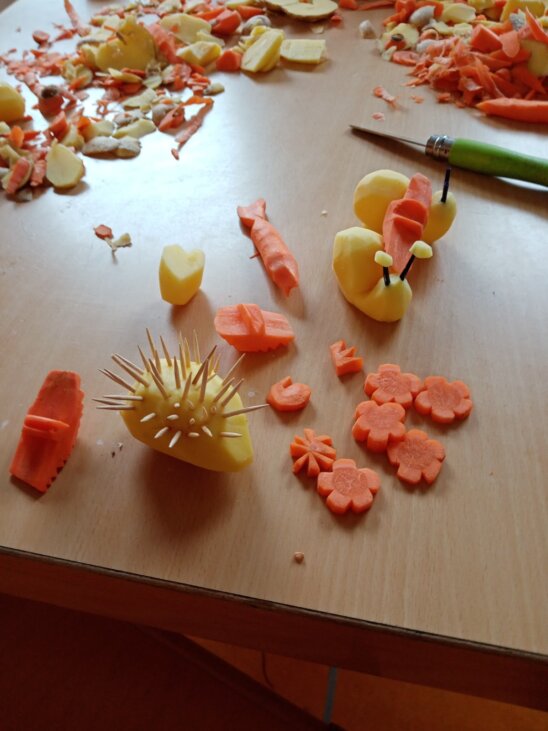 Das Schnitzen aus Gemüse hatte auch einen tollen Nebeneffekt: Die Kinder konnten lernen, dass Kartoffeln schälen doch nicht so einfach ist, wie es bei Mama immer scheint…
