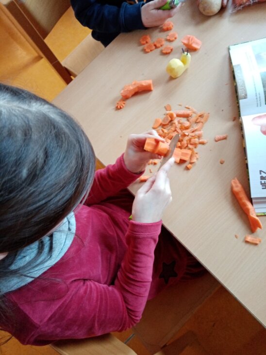 Das stellten wir in unserem Hortprojekt besonders beim Schnitzen fest. Bedauerlicherweise stellte sich heraus, dass viel Geduld und Zeit nötig war, um mit dem vorhandenen Holz tolle Figuren zu schnitzen. Deshalb war etwas Kreativität und Improvisationsgabe nötig: Kurzerhand besorgten wir Kartoffeln und Möhren, und die Kinder schnitzten daraus kleine Gemüse-Figuren. Die eine oder andere Möhre landete auch im Bauch der Kinder.