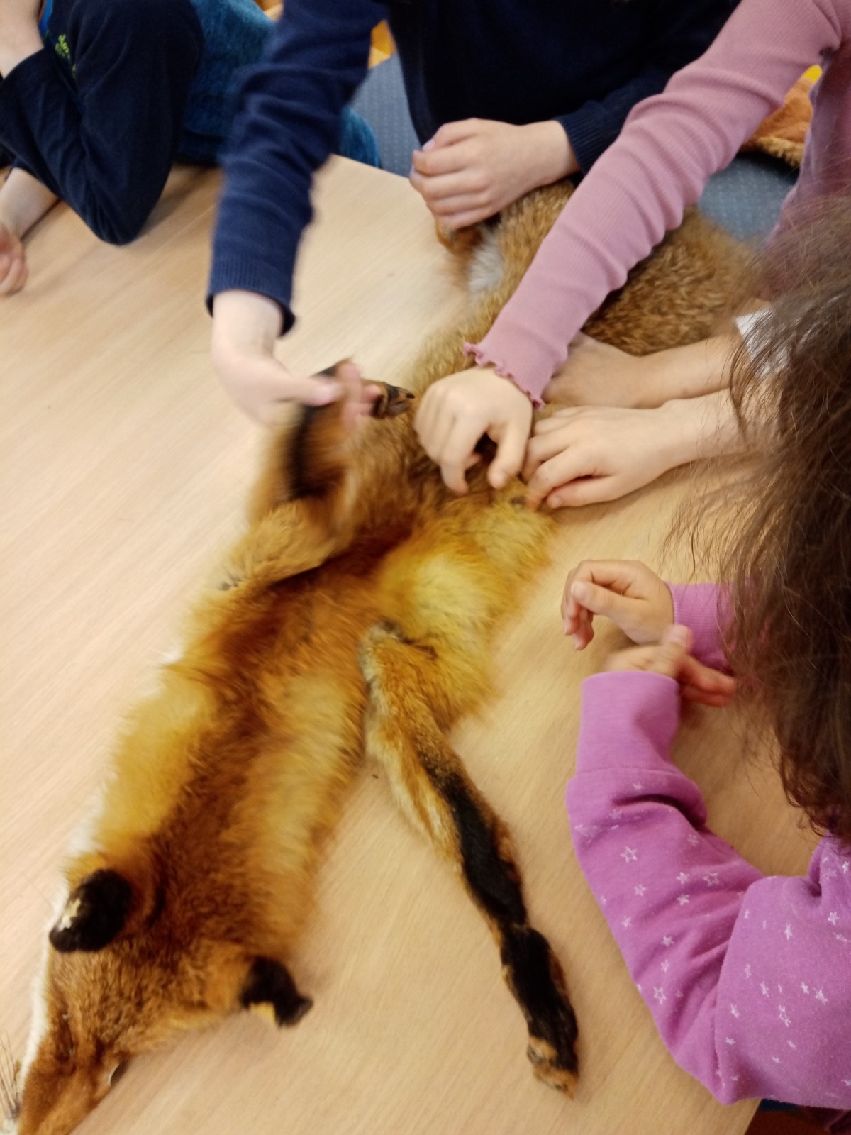 Zum Abschluss des Vormittages durften wir uns dann die mitgebrachten Felle ansehen. Wir hatten hier unter anderem die Chance, einen Dachs, einen Fuchs und ein Wildschwein zu streicheln. Beim einem Geweih waren wir von dessen großem Gewicht überrascht - was so ein Hirsch mit sich herumschleppt!