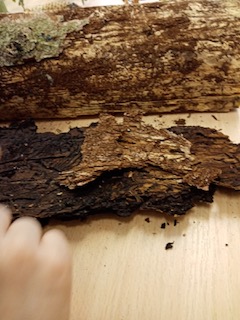 Erste Aufgabe war es, die mitgebrachten Abschnitte und Hölzer der Bäume zu benennen und den Laub- oder Nadelbäumen zuzuordnen. Die Kinder verdeutlichten hier schnell ihr persönliches Wissen, und so waren die Bäume schnell benannt. Herr Schubert erklärte uns dann noch einige Besonderheiten. So forderte er uns auf, an der Nadel der Douglasie zu riechen. Über den zitronigen Geruch waren wir dabei wirklich überrascht. Außerdem erklärte er uns, wie wir aus dem Stamm einer Birke das Birkenwasser auffangen und wozu wir dieses nutzen können. Als wir dann noch einen Blick unter die Rinde eines Stammes wagten, konnten wir sogar kleine Borkenkäfer und ihre selbstgebauten Gänge entdecken. So ein kleiner Käfer kann ganze Wälder kaputtmachen.