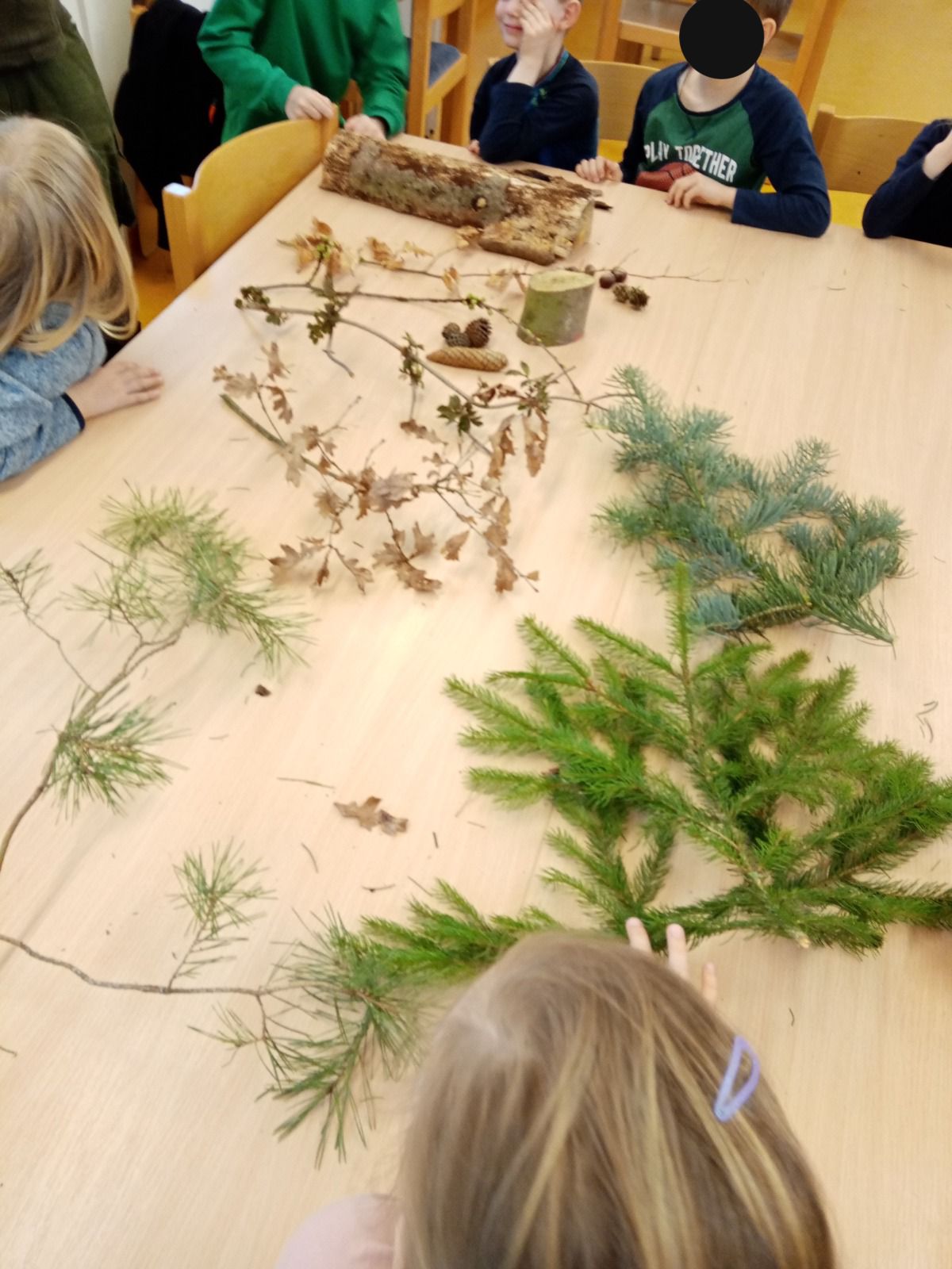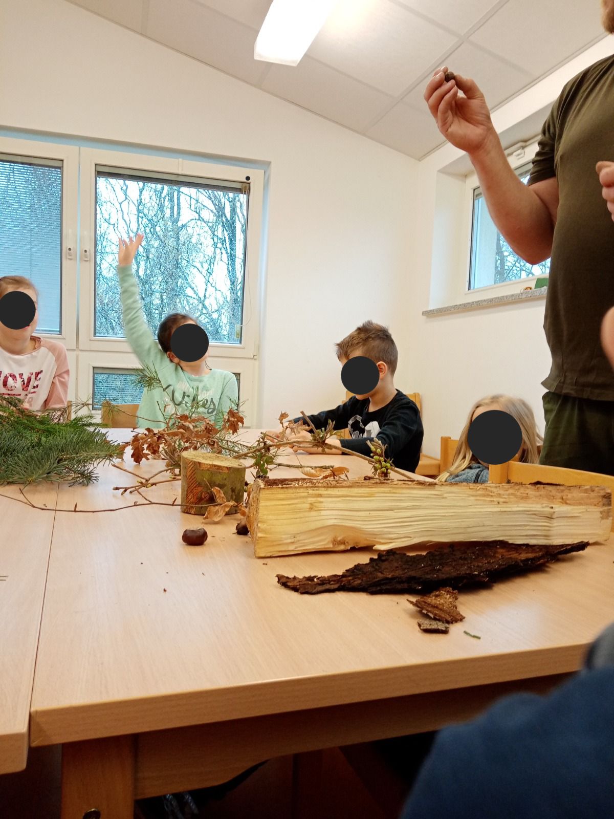 Herr Schubert organisierte sogar einige Abschnitte von heimatlichen Bäumen. Außerdem brachte er verschiedene Hölzer und auch ein paar Felle mit, die wir später sogar anfassen durften.