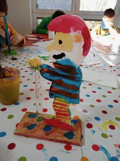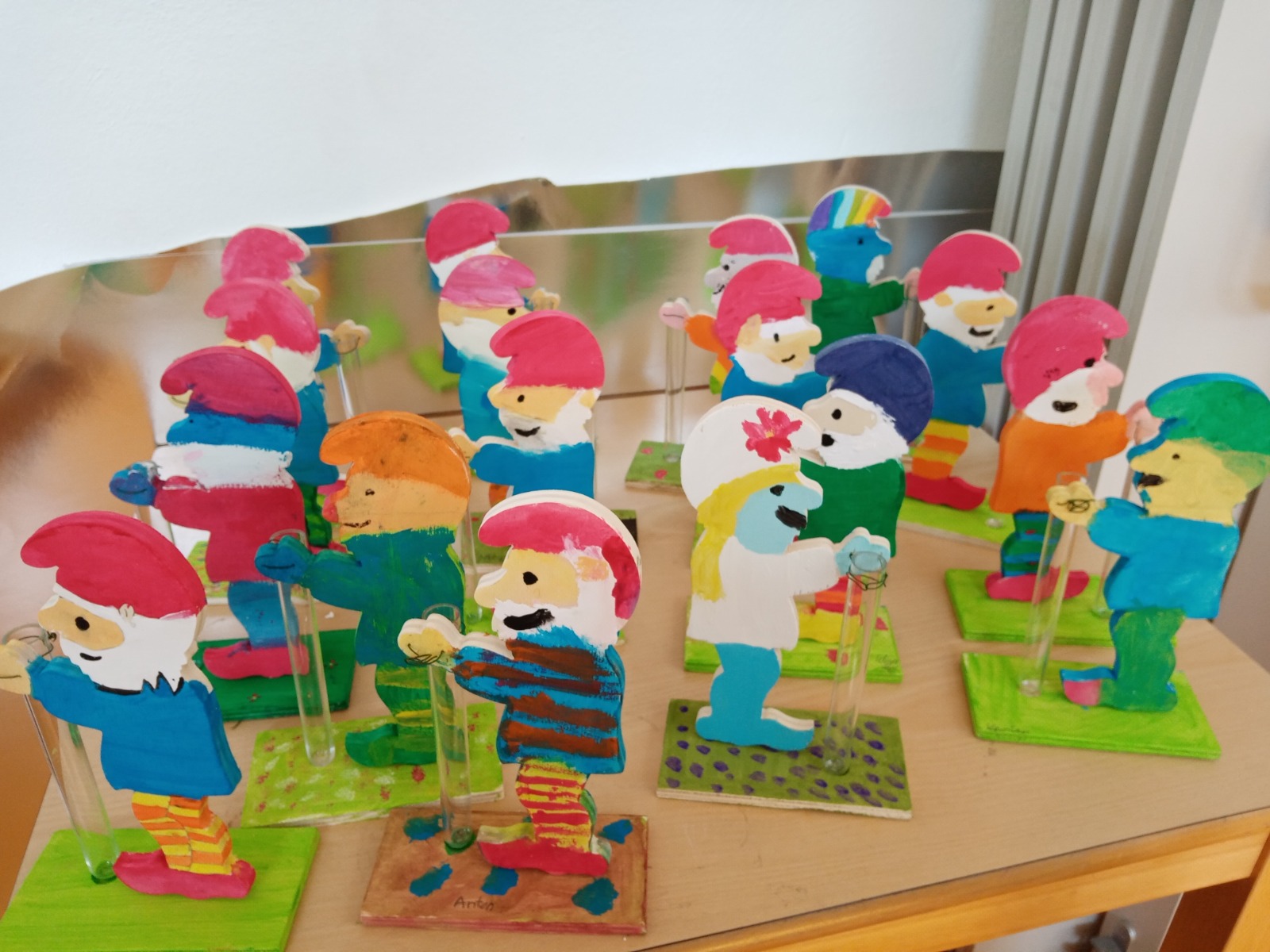 Unsere Aufgabe war es zunächst alle Einzelteile gründlich zu schleifen. Nachdem wir dies erledigt hatten, konnten wir unserer Kreativität freien Lauf lassen. Mit Pinsel und Farbe begannen wir, nach unseren Vorstellungen Zwerge zu gestalten. Abschließend befestigten wir noch Reagenzgläser an unseren Zwergen, in welches wir Zuhause Blumen stecken können.