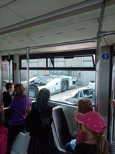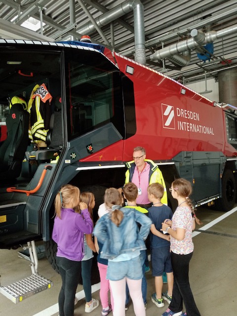 Die Flughafenfeuerwehrleute erklärten uns, welche Maßnahmen im Falle eines Brandes oder im Notfall getroffen werden. Die hochmodernen Feuerwehrautos beeindruckten uns sehr, und wir durften uns sogar in eins hereinsetzen.