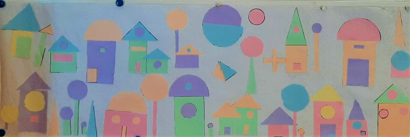 Die Stadt ist eigentlich noch ein wenig klein. Der Bürgermeister und alle Bewohner wünschen sich noch mehr lustige Menschen und Häuser, die aus vielen verschiedenen Formen und Farben bestehen. Zurzeit wir ein großer Spielplatz gebaut - natürlich aus Vierecken, Dreiecken und Kreisen.
