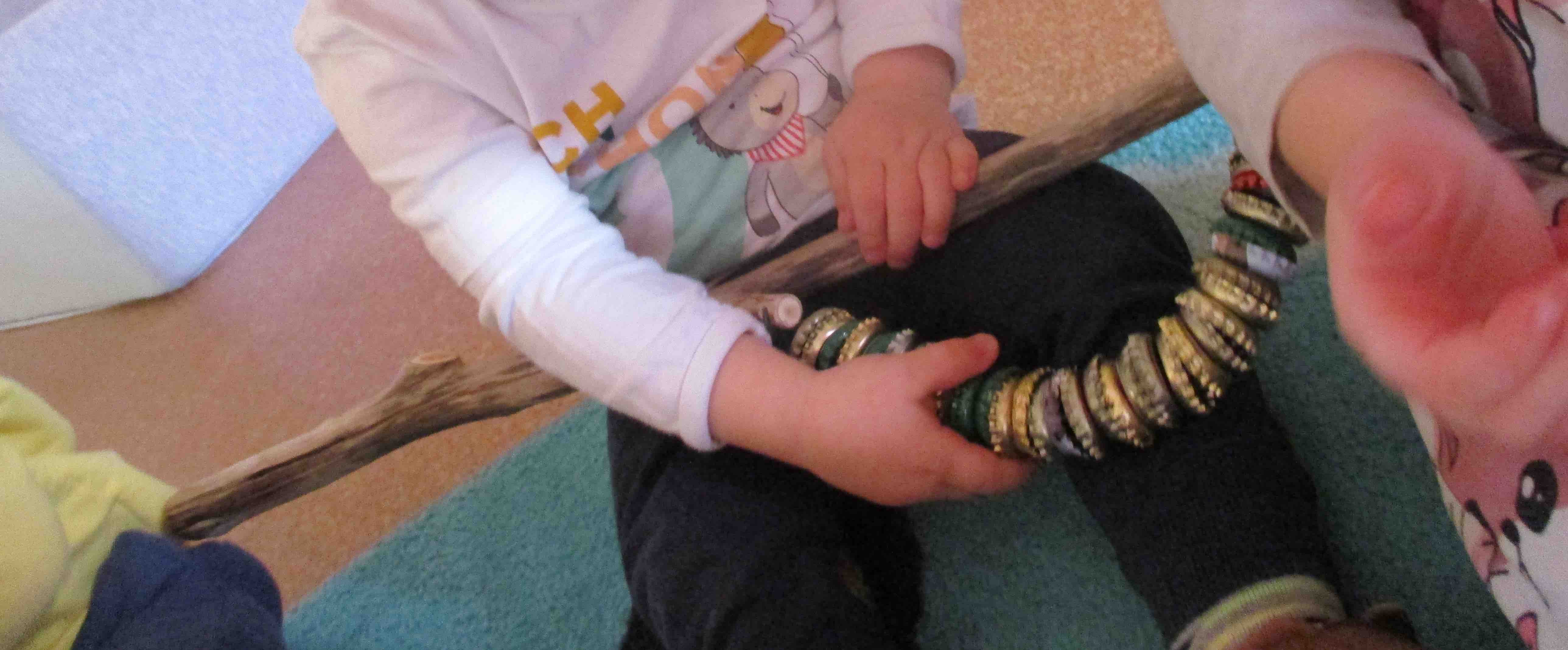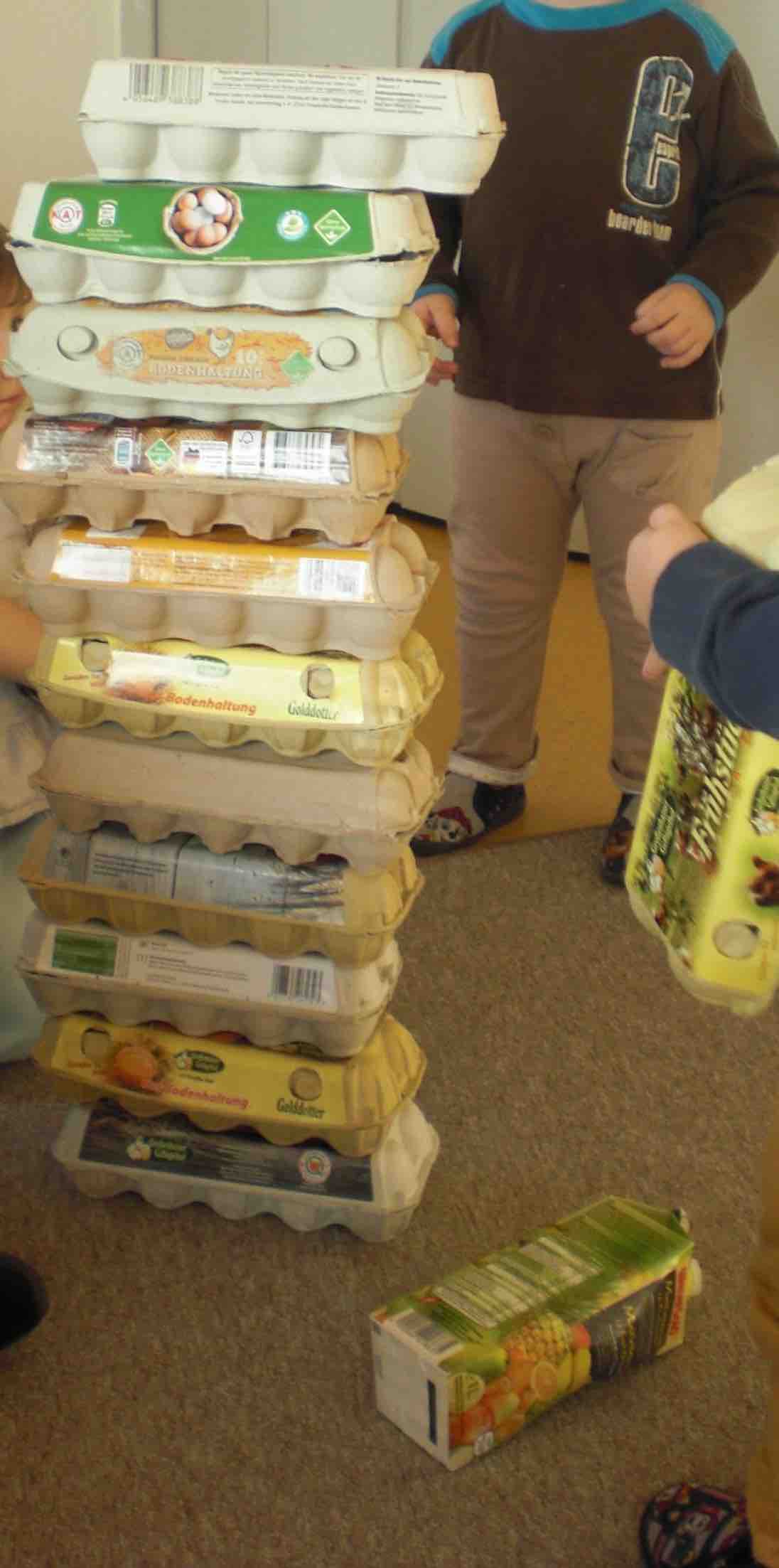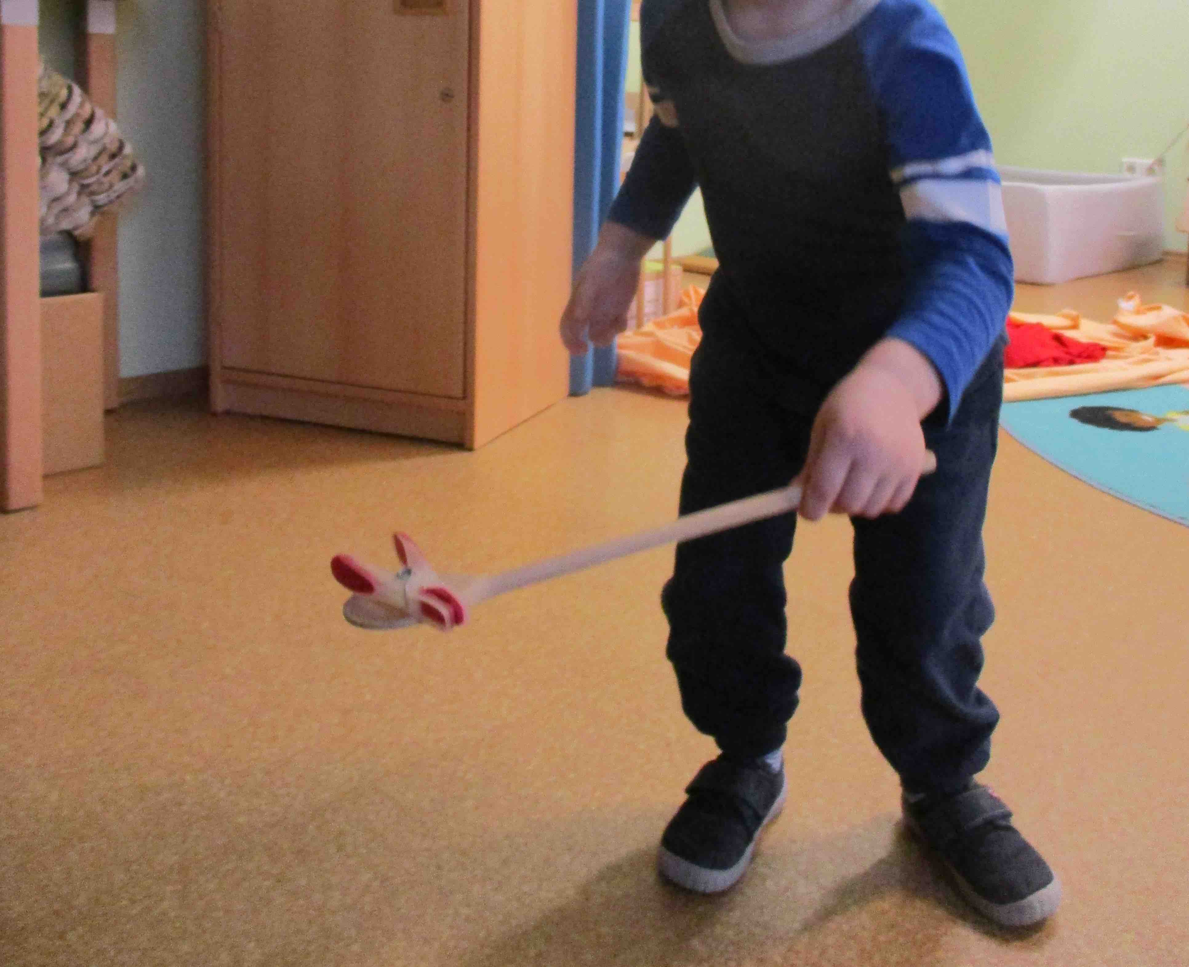 In sechs Wochen spielzeugfreier Zeit entdeckten und erforschten die Kinder „zweckfremde“ Einsatzmöglichkeiten des Alltagsmaterials. Sie experimentierten und entwickelten immer neue Spielideen. Bald waren die Kisten ein Auto und ein Zug, in dem man zur Oma fuhr, oder ein Turm. Manchmal mussten wir Erwachsenen unterstützen, z.B. beim Herstellen der Astgabelrasseln.