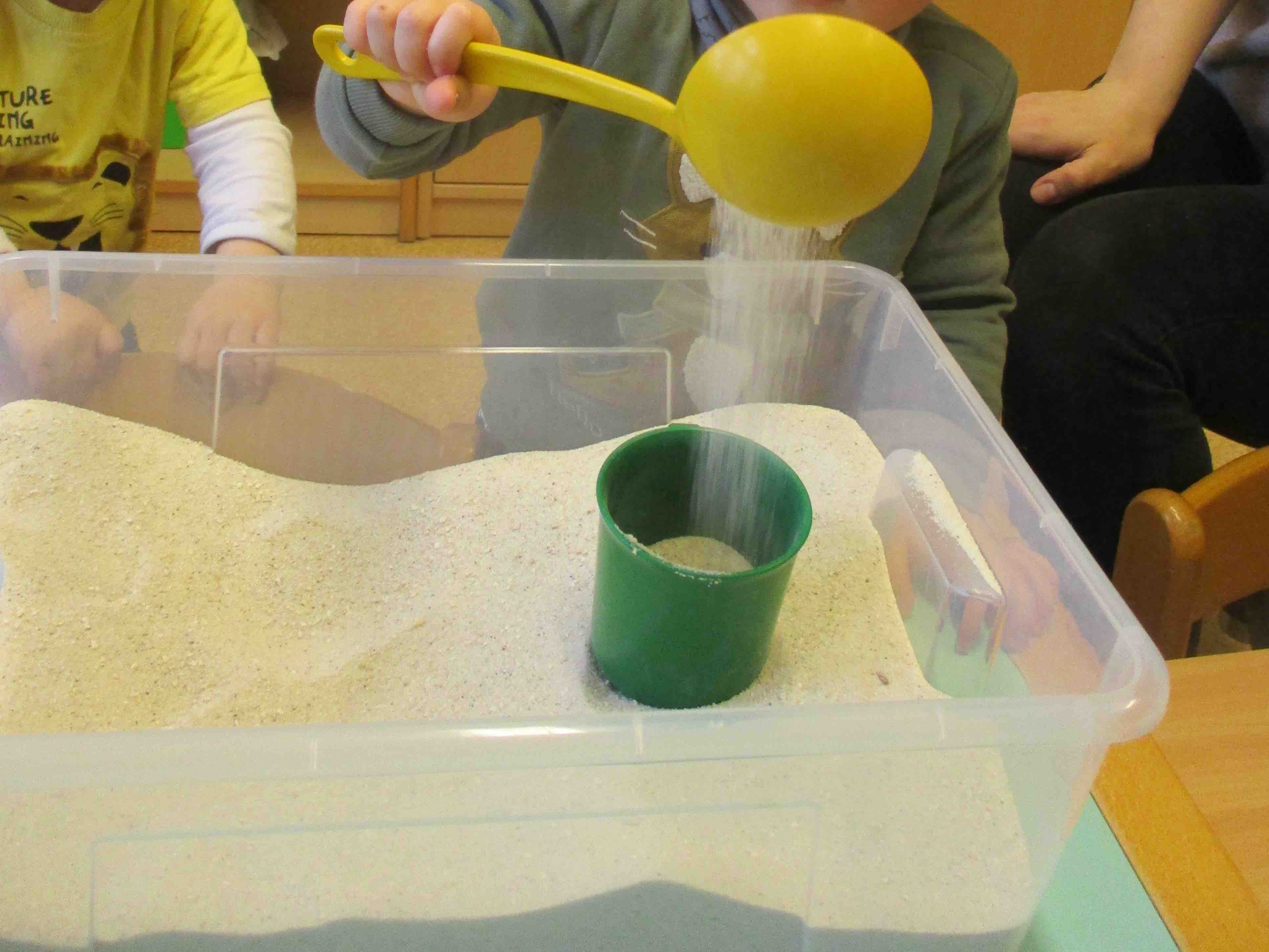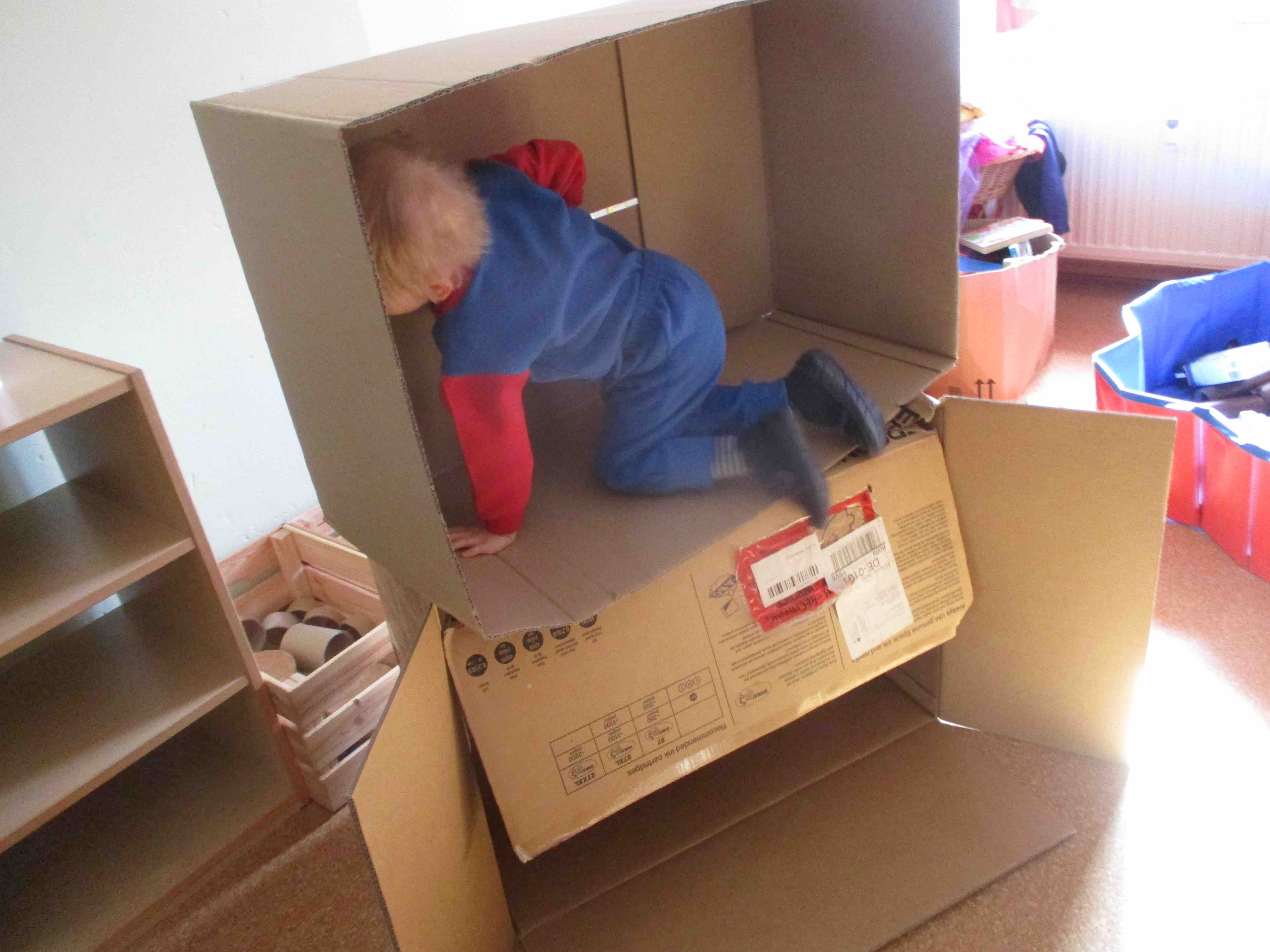 Dann zog Alltagsmaterial ein: Pappkartons, Eierkartons, Wäscheklammern, Verpackungen, Bänder, Aktionstabletts und Naturmaterialien, Küchenutensilien und Schüttmaterial … - unseren Krippen-Eltern ein herzliches Danke für die tolle Unterstützung! Zuerst war es komisch, aber die Kleinen ließen sich unkompliziert darauf ein.