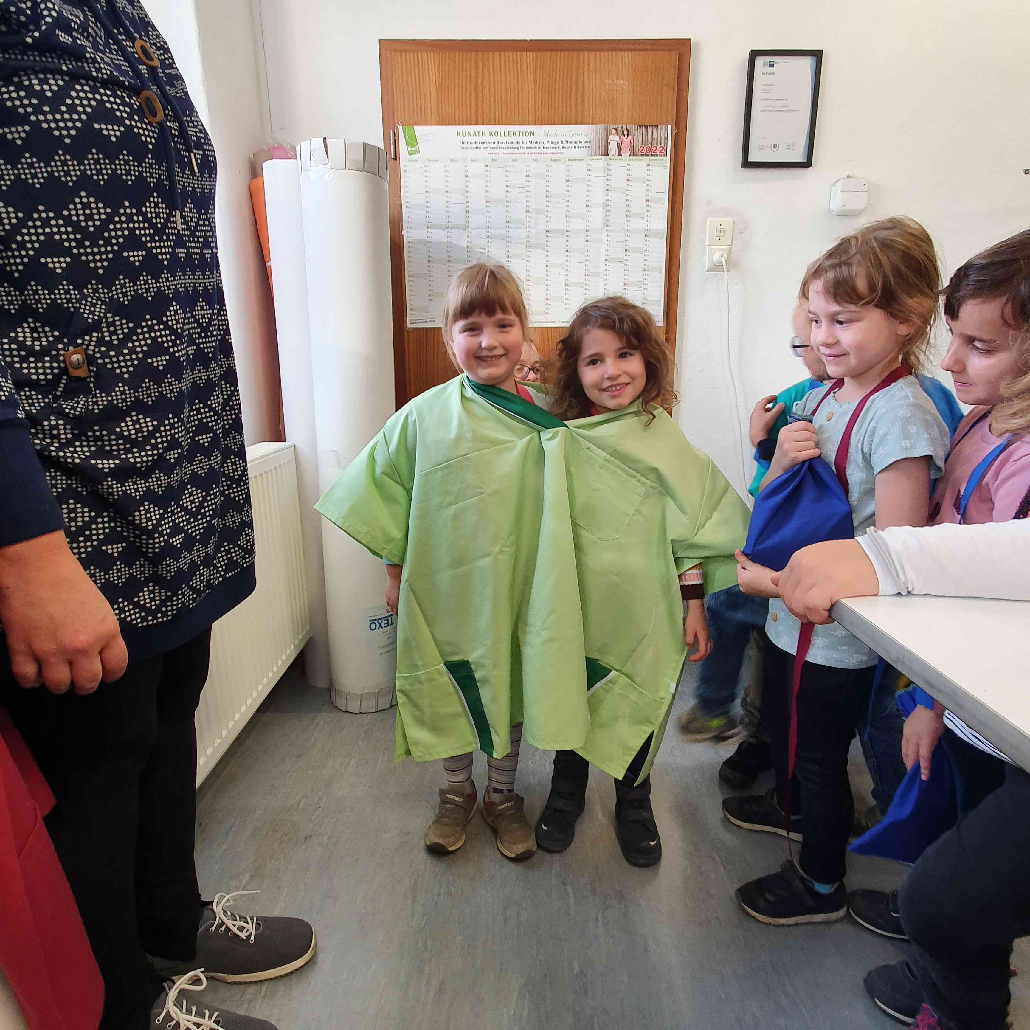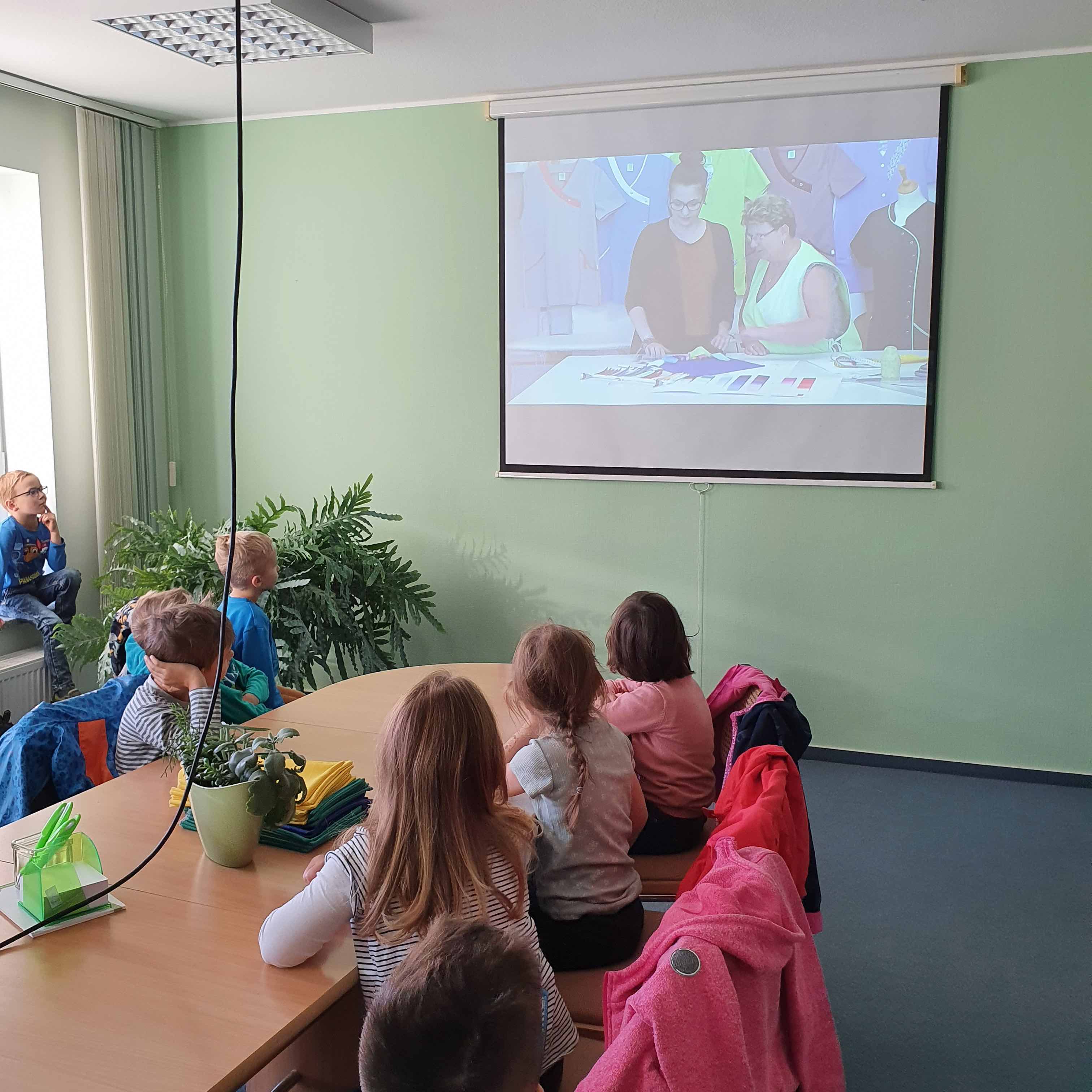 Ein kleiner Film zeigte uns, wie aus einer Idee ein Kleidungsstück werden kann. Und wir durften uns nun alle Produktionsschritte live ansehen. Wir lernten, dass Arbeitskleidung eine wichtige Funktion hat: den Arbeitsschutz. Sie soll bequem sein und die Arbeit erleichtern. Und natürlich soll sie auch sehr cool aussehen. Wenn all das stimmt, ist man stolz sie zu tragen. Die Erzieherinnen der Bretniger Kita haben sich hier T-Shirts mit Logo entwerfen lassen. Wenn ein Fest ist, erkennt man die Erzieherinnen dann sofort.