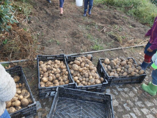 - Bei Familie R durften wir mit zur Kartoffelernte, und jedes Kind durfte sich seinen „Kartoffelkönig“ mitnehmen.