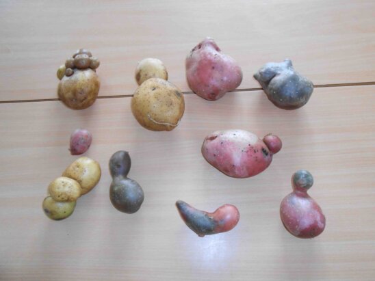 - Wir schauten uns verschiedene Kartoffelsorten an ( auch alte Kartoffeln vom Vorjahr ), sortierten nach Größe, Farbe, Gewicht.
