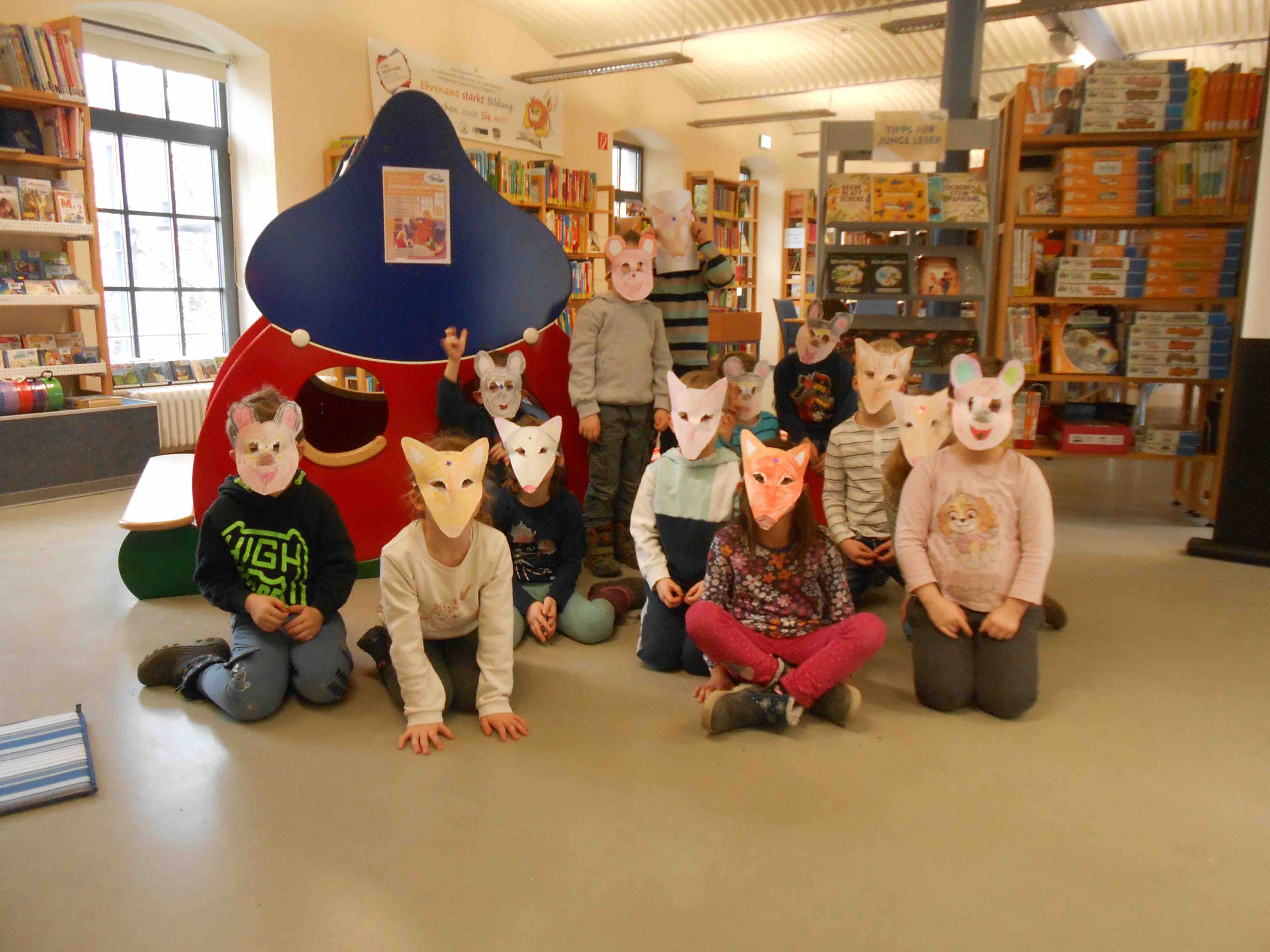 Nach der Geschichte “Fuchs und Maus in der Bibliothek“ konnte jedes Kind ein erstes Buch für sich ausleihen. Und diese tollen Masken haben wir auch gebastelt; seht ihr sie?