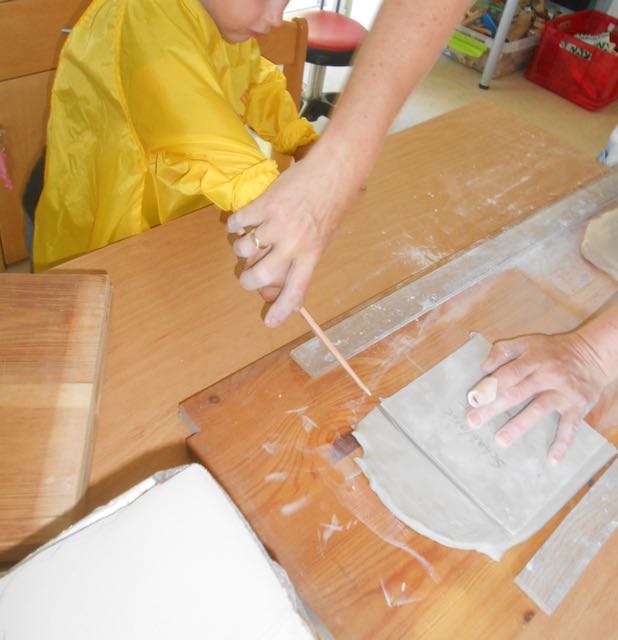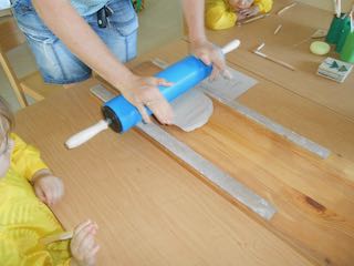 Das Ausrollen des Tons übernahm die Projektleiterin Martina, dann schnitt jedes Kind eine Kachel mit Hilfe einer Schablone aus. Die Rückseite wurde mit einer Gabel aufgeraut, und schon konnten alle die Vorderseite gestalten. Es gab eine Vielzahl an Arbeitsmaterialen, aus denen die Kinder auswählen konnten.