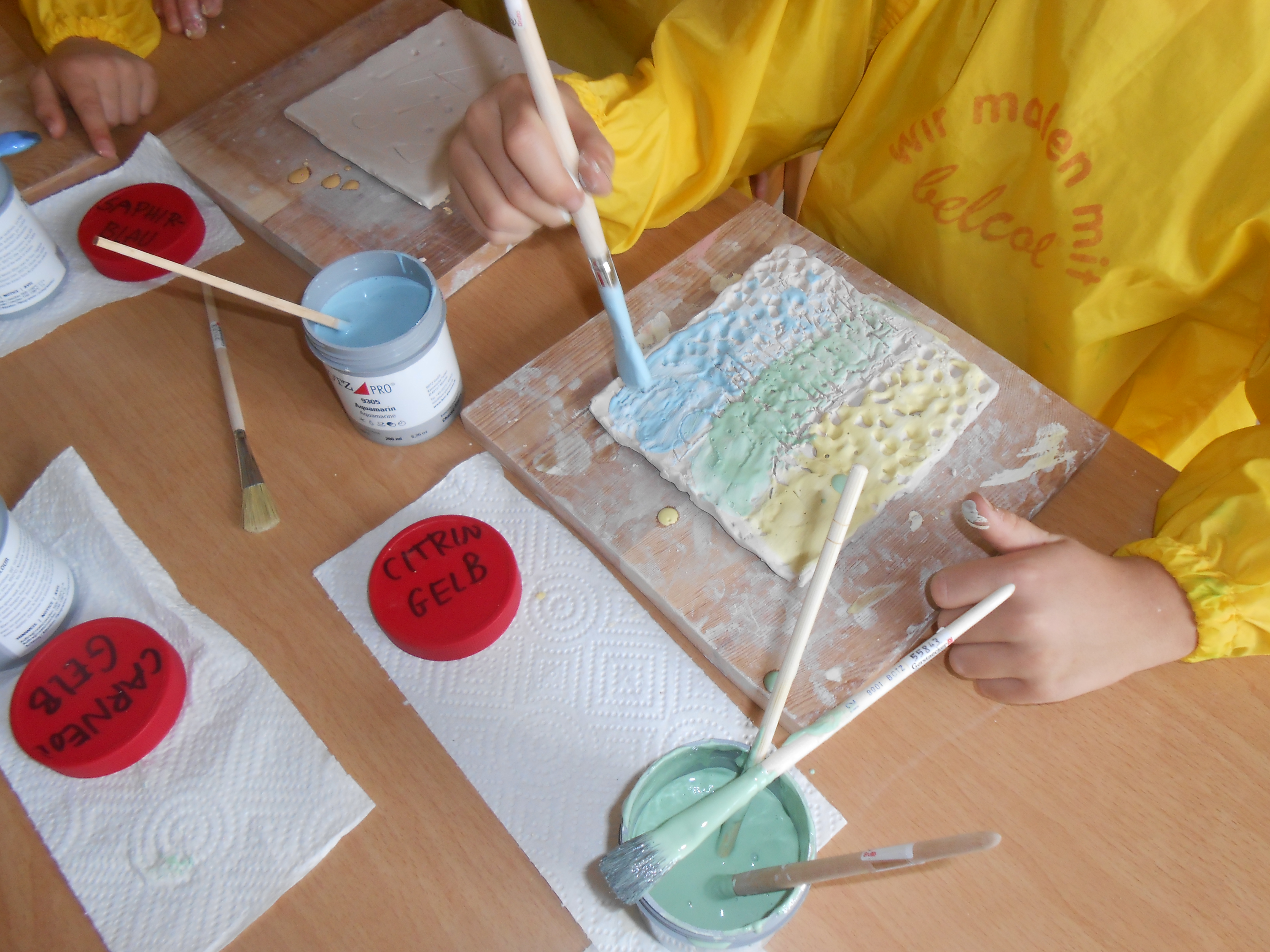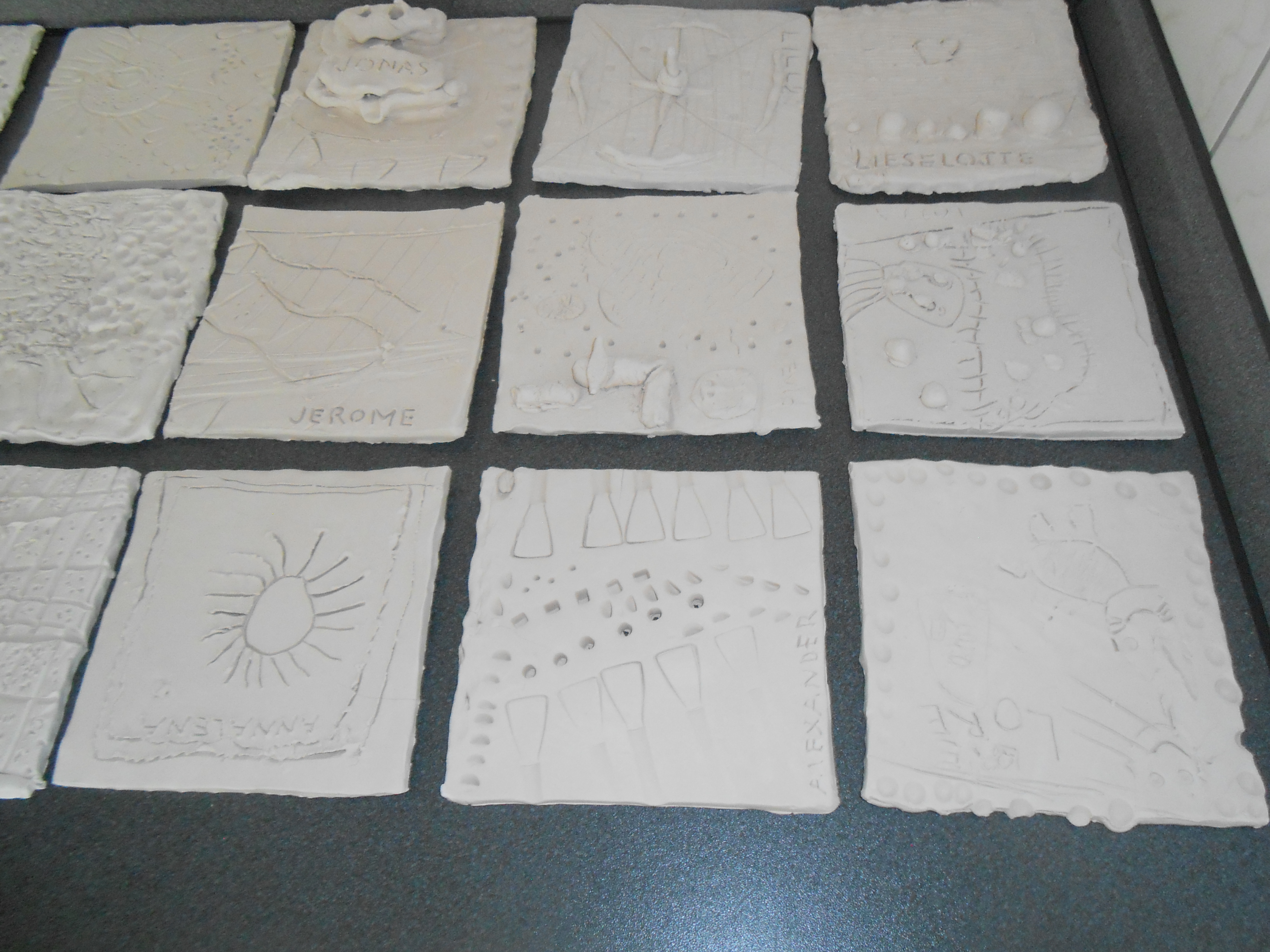 Jedes Kind hatte Zeit und Ruhe für die individuelle Gestaltung und legte seine fertige Kachel anschließend zum Trocknen ab. Zwei Wochen später bemalten die Kinder ihre Tonkacheln. Die Farben der Glasuren wirken noch etwas blass - und die Kinder staunen, wie kraftvoll die Farben nach dem Brennen dann leuchten.