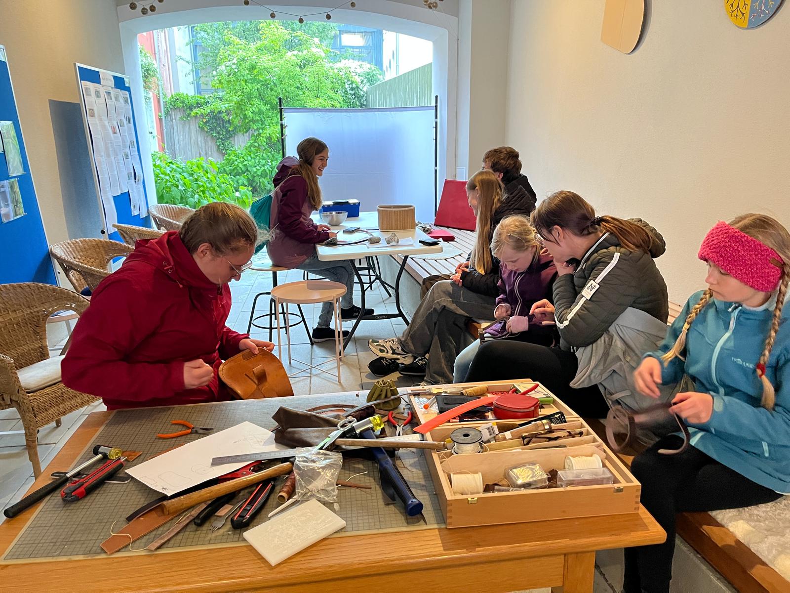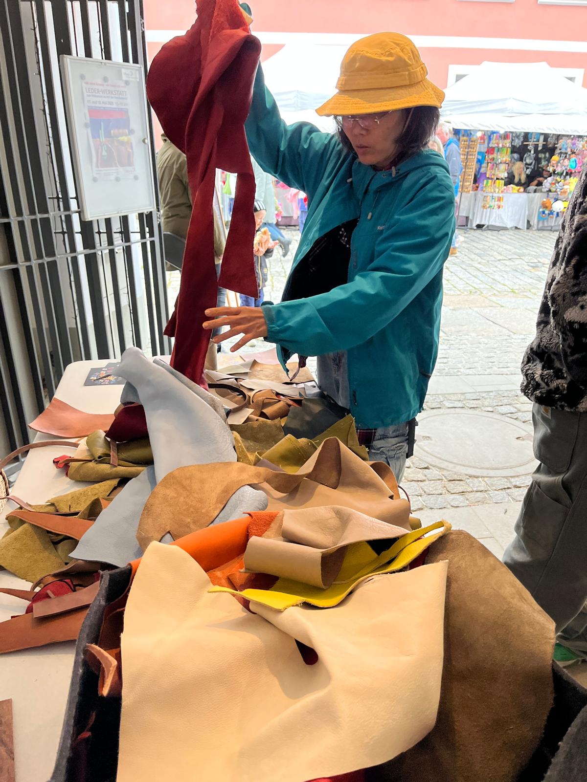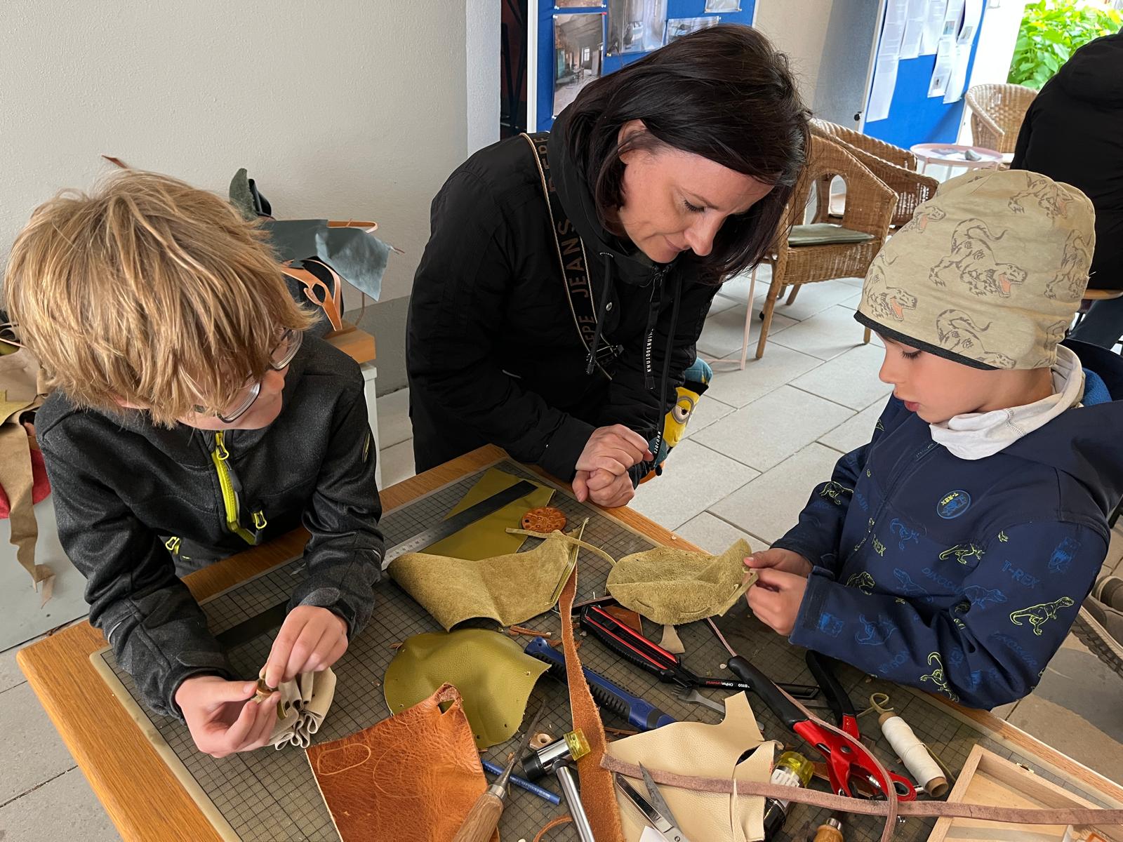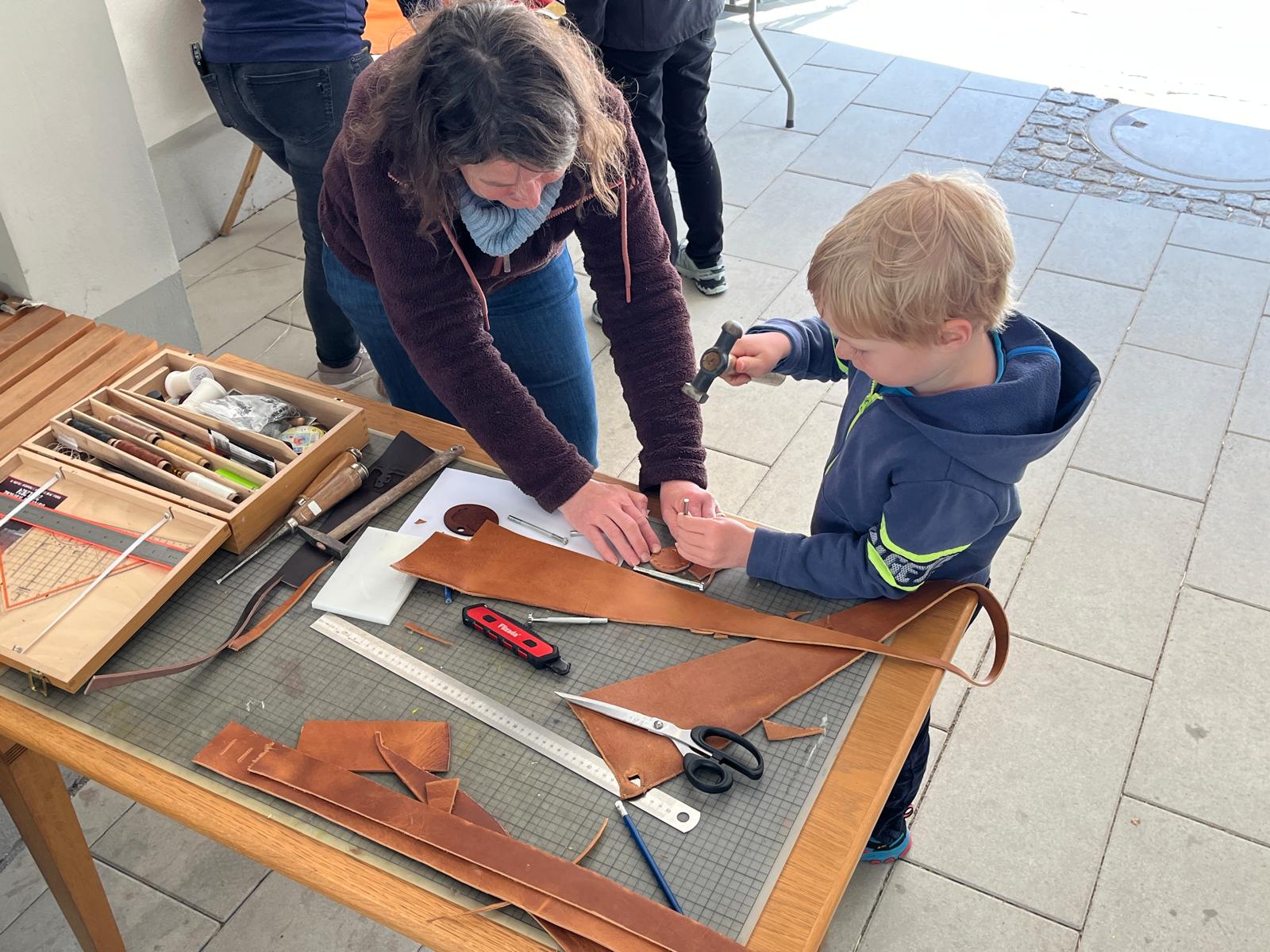 Viele kleine und große Besucherinnen und Besucher strömten in unseren Hof, in dem Martina Burghart-Vollhardt eine kleine Mitmach-Lederwerkstatt anbot. Jeder konnte sich sein Lieblingsleder aussuchen und ein Täschchen, Mäppchen oder Büchlein etc. herstellen. Man trug kleine Wunderwerke mit nach Hause ...